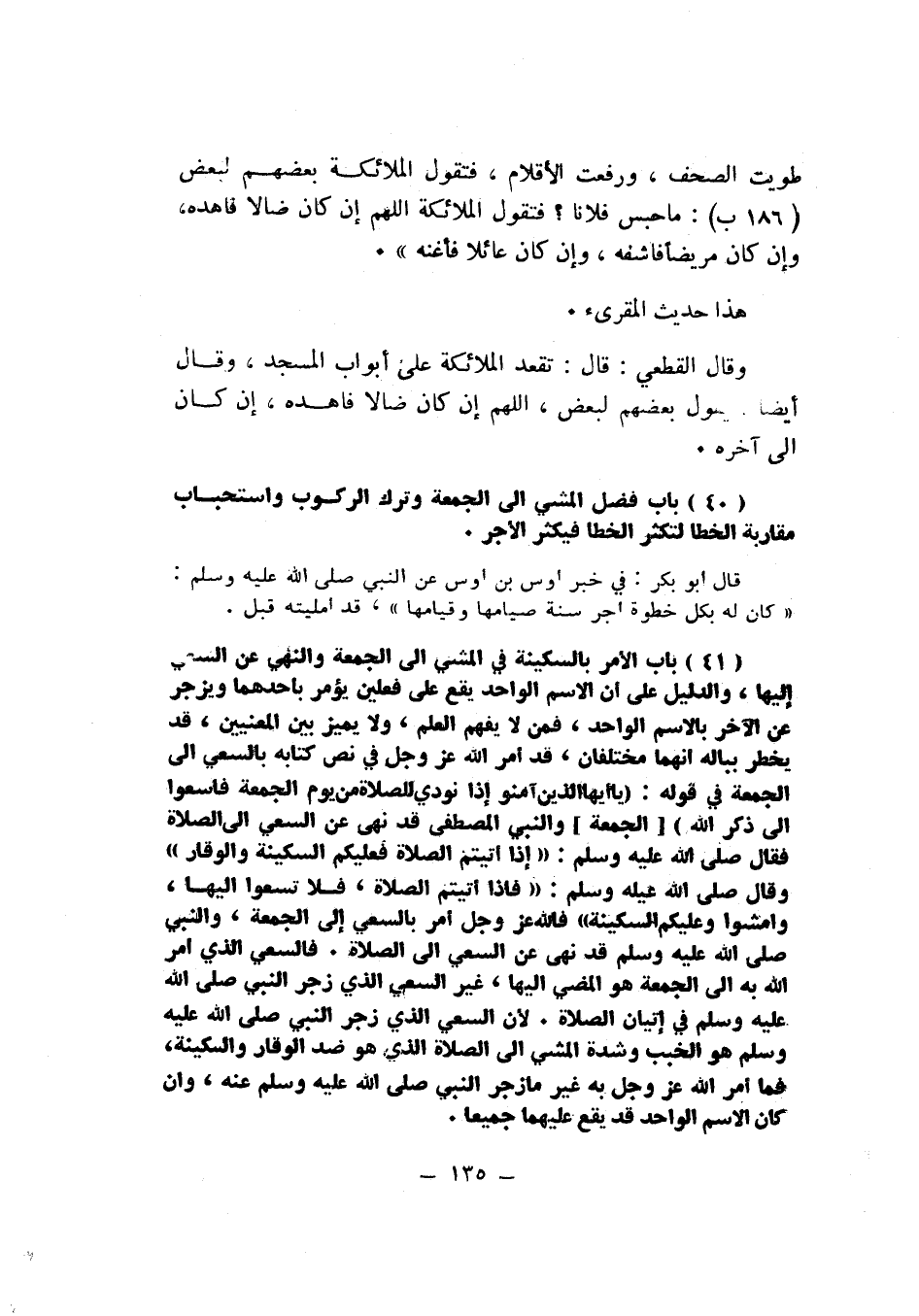 §بَابُ الْأَمْرِ بِالسَّكِينَةِ فِي الْمَشْيِ إِلَى الْجُمُعَةِ، وَالنَّهْيِ عَنِ السَّعْيِ إِلَيْهَا، وَالدَّلِيلُ عَلَى أَنَّ الِاسْمَ الْوَاحِدَ يَقَعُ عَلَى فِعْلَيْنِ يُؤْمَرُ بِأَحَدِهِمَا، وَيُزْجَرُ عَنِ الْآخَرِ بِالِاسْمِ الْوَاحِدِ، فَمَنْ لَا يَفْهَمُ الْعِلْمَ، وَلَا يُمَيِّزُ بَيْنَ الْمَعْنَيَيْنِ، قَدْ يَخْطِرُ بِبَالِهِ أَنَّهُمَا مُخْتَلِفَانِ، قَدْ أَمَرَ اللَّهُ عَزَّ وَجَلَّ فِي نَصِّ كِتَابِهِ السَّعْيَ إِلَى الْجُمُعَةِ فِي قَوْلِهِ: {يَا أَيُّهَا الَّذِينَ آمَنُوا إِذَا نُودِيَ لِلصَّلَاةِ مِنْ يَوْمِ الْجُمُعَةِ فَاسْعَوْا إِلَى ذِكْرِ اللَّهِ} [الجمعة: 9] ، وَالنَّبِيُّ الْمُصْطَفَى قَدْ نَهَى عَنِ السَّعْيِ إِلَى الصَّلَاةِ، فَقَالَ صَلَّى اللهُ عَلَيْهِ وَسَلَّمَ: «إِذَا أَتَيْتُمُ الصَّلَاةَ فَعَلَيْكُمُ السَّكِينَةَ، وَالْوَقَارَ» ، وَقَالَ صَلَّى اللهُ عَلَيْهِ وَسَلَّمَ: «فَإِذَا أَتَيْتُمُ الصَّلَاةَ، فَلَا تَسْعَوْا إِلَيْهَا، وَامْشُوا، وَعَلَيْكُمُ السَّكِينَةُ» ، فَاللَّهُ عَزَّ وَجَلَّ أَمَرَ بِالسَّعْيِ إِلَى الْجُمُعَةِ، وَالنَّبِيُّ صَلَّى اللهُ عَلَيْهِ وَسَلَّمَ قَدْ نَهَى عَنِ السَّعْيِ إِلَى الصَّلَاةِ، فَالسَّعْيُ الَّذِي أَمَرَ اللَّهُ بِهِ إِلَى الْجُمُعَةِ هُوَ الْمُضِيُّ إِلَيْهَا، غَيْرُ السَّعْيِ الَّذِي زَجَرَ النَّبِيُّ صَلَّى اللهُ عَلَيْهِ وَسَلَّمَ فِي إِتْيَانِ الصَّلَاةِ؛ لِأَنَّ السَّعْيَ الَّذِي زَجَرَ النَّبِيُّ صَلَّى اللهُ عَلَيْهِ وَسَلَّمَ هُوَ الْخَبَبُ، وَشِدَّةُ الْمَشْيِ إِلَى الصَّلَاةِ الَّذِي هُوَ ضِدُّ الْوَقَارِ، وَالسَّكِينَةِ، فَمَا أَمَرَ اللَّهُ عَزَّ وَجَلَّ بِهِ غَيْرُ مَا زَجَرَ النَّبِيُّ صَلَّى اللهُ عَلَيْهِ وَسَلَّمَ عَنْهُ، وَإِنْ كَانَ الِاسْمُ الْوَاحِدُ قَدْ يَقَعُ عَلَيْهِمَا جَمِيعًا قَالَ أَبُو بَكْرٍ: خَبَرُ النَّبِيِّ صَلَّى اللهُ عَلَيْهِ وَسَلَّمَ: «إِذَا أَتَيْتُمُ الصَّلَاةَ، فَعَلَيْكُمُ السَّكِينَةَ، وَالْوَقَارَ»