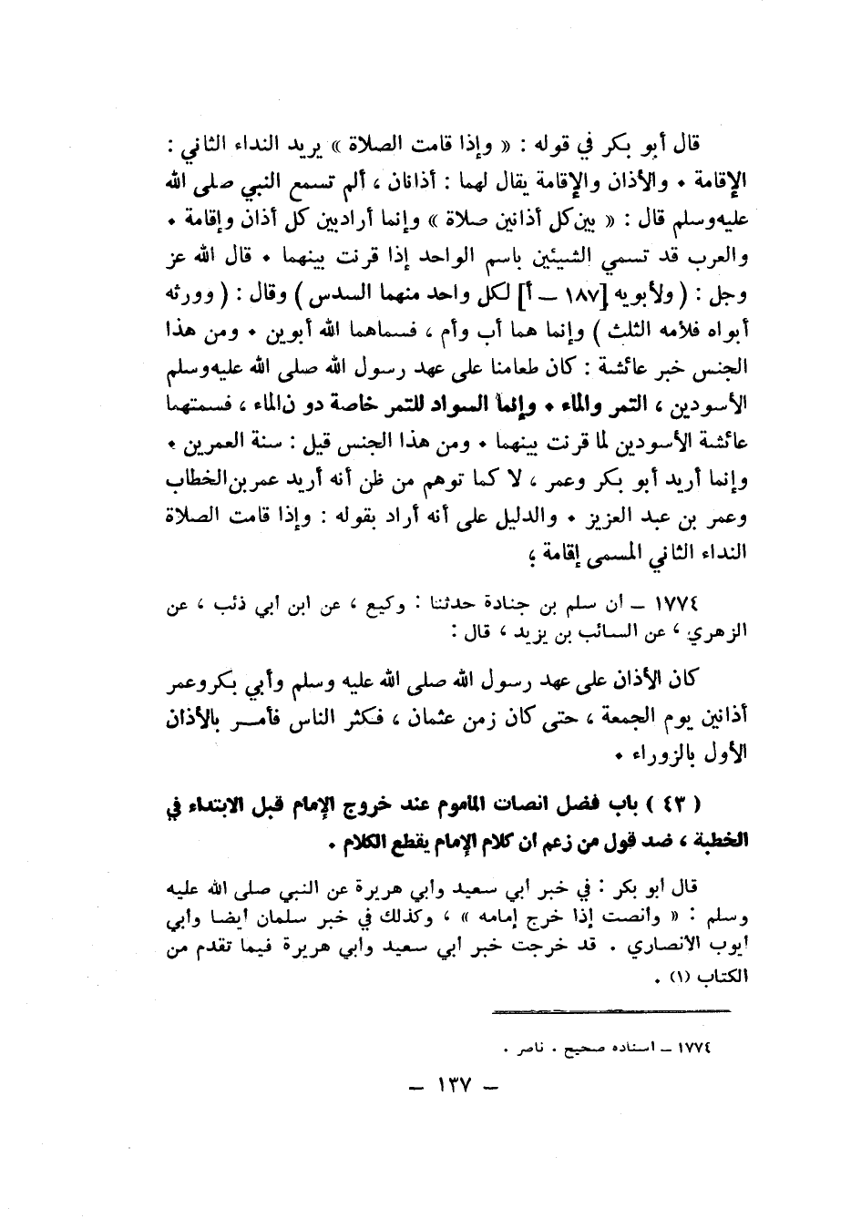 1774 - أَنَّ سَلْمَ بْنَ جُنَادَةَ، حَدَّثَنَا وَكِيعٌ، عَنِ ابْنِ أَبِي ذِئْبٍ، عَنِ الزُّهْرِيِّ، عَنِ السَّائِبِ بْنِ يَزِيدَ قَالَ: «كَانَ §الْأَذَانُ عَلَى عَهْدِ رَسُولِ اللَّهِ صَلَّى اللهُ عَلَيْهِ وَسَلَّمَ , وَأَبِي بَكْرٍ , وَعُمَرَ أَذَانَيْنِ يَوْمَ الْجُمُعَةِ , حَتَّى كَانَ زَمَنُ عُثْمَانَ , فَكَثُرَ النَّاسُ , فَأَمَرَ بِالْأَذَانِ الْأَوَّلِ بِالزَّوْرَاءِ» K1774 - قال الألباني: إسناده صحيح