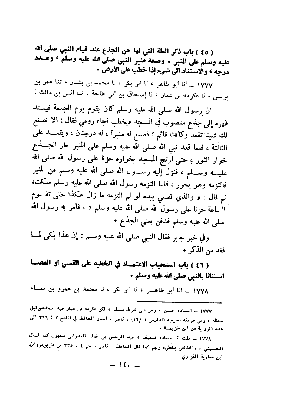 1777 - نا مُحَمَّدُ بْنُ بَشَّارٍ، ثنا عُمَرُ بْنُ يُونُسَ، نا عِكْرِمَةُ بْنُ عَمَّارٍ، نا إِسْحَاقُ بْنُ أَبِي طَلْحَةَ، ثنا أَنَسُ بْنُ مَالِكٍ، أَنَّ رَسُولَ اللَّهِ صَلَّى اللهُ عَلَيْهِ وَسَلَّمَ كَانَ يَقُومُ يَوْمَ الْجُمُعَةِ فَيُسْنِدُ ظَهْرَهُ إِلَى جِذْعٍ مَنْصُوبٍ فِي الْمَسْجِدِ فَيَخْطُبُ , فَجَاءَ رُومِيٌّ فَقَالَ: أَلَا نَصْنَعُ لَكَ شَيْئًا تَقْعُدُ وَكَأَنَّكَ قَائِمٌ؟ فَصَنَعَ لَهُ مِنْبَرًا لَهُ دَرَجَتَانِ , وَيَقْعُدُ عَلَى الثَّالِثَةِ , فَلَمَّا قَعَدَ نَبِيُّ اللَّهِ صَلَّى اللهُ عَلَيْهِ وَسَلَّمَ عَلَى الْمِنْبَرِ خَارَ الْجِذْعُ خُوَارَ الثَّوْرِ حَتَّى ارْتَجَّ الْمَسْجِدُ بِخُوَارِهِ حُزْنًا عَلَى رَسُولِ اللَّهِ صَلَّى اللهُ عَلَيْهِ وَسَلَّمَ , فَنَزَلَ إِلَيْهِ رَسُولُ اللَّهِ صَلَّى اللهُ عَلَيْهِ وَسَلَّمَ مِنَ الْمِنْبَرِ , فَالْتَزَمَهُ وَهُوَ يَخُورُ , فَلَمَّا الْتَزَمَهُ رَسُولُ اللَّهِ صَلَّى اللهُ عَلَيْهِ وَسَلَّمَ سَكَتَ , ثُمَّ قَالَ: «وَالَّذِي نَفْسِي بِيَدِهِ , §لَوْ لَمْ أَلْتَزِمْهُ مَا زَالَ هَكَذَا حَتَّى تَقُومَ السَّاعَةُ حُزْنًا عَلَى رَسُولِ اللَّهِ صَلَّى اللهُ عَلَيْهِ وَسَلَّمَ» , فَأَمَرَ بِهِ رَسُولُ اللَّهِ صَلَّى اللهُ عَلَيْهِ وَسَلَّمَ فَدُفِنَ - يَعْنِي الْجِذْعَ -. وَفِي خَبَرِ جَابِرٍ: فَقَالَ النَّبِيُّ صَلَّى اللهُ عَلَيْهِ وَسَلَّمَ: «إِنَّ هَذَا بَكَى لِمَا فَقَدَ مِنَ الذِّكْرِ» K1777 - قال الأعظمي: إسناده حسن وهو على شرط مسلم