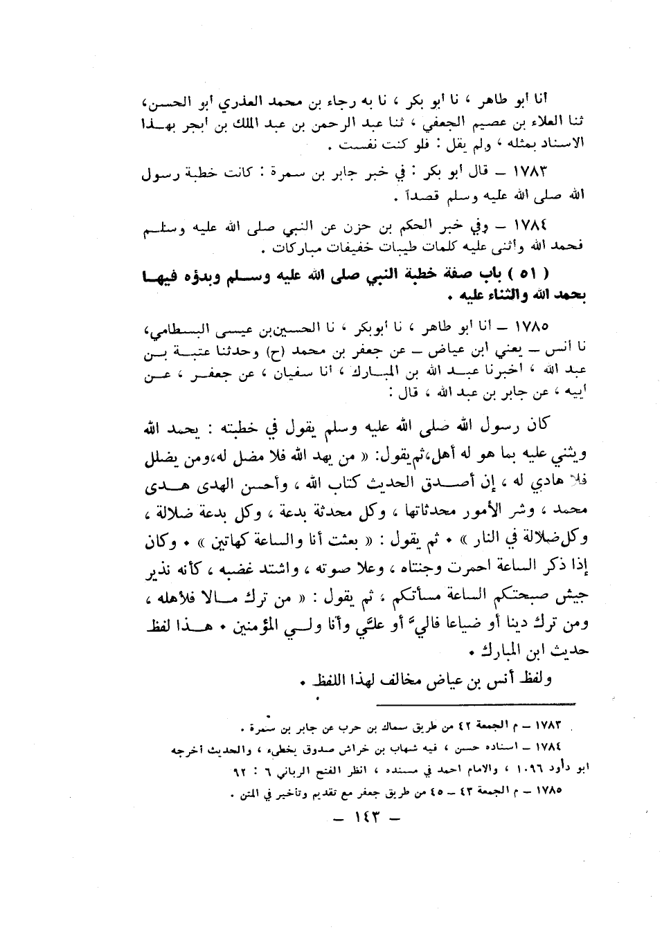 1785 - نا الْحُسَيْنُ بْنُ عِيسَى الْبِسْطَامِيُّ، نا أَنَسٌ يَعْنِي ابْنَ عِيَاضٍ، عَنْ جَعْفَرِ بْنِ مُحَمَّدٍ، ح، وَحَدَّثَنَا عُتْبَةُ بْنُ عَبْدِ اللَّهِ، أَخْبَرَنَا عَبْدُ اللَّهِ بْنُ الْمُبَارَكِ، أنا سُفْيَانُ، عَنْ جَعْفَرٍ، عَنْ أَبِيهِ، عَنْ جَابِرِ بْنِ عَبْدِ اللَّهِ قَالَ: كَانَ رَسُولُ اللَّهِ صَلَّى اللهُ عَلَيْهِ وَسَلَّمَ يَقُولُ فِي خُطْبَتِهِ , يَحْمَدُ اللَّهَ , وَيُثْنِي عَلَيْهِ بِمَا هُوَ لَهُ أَهْلٌ , ثُمَّ يَقُولُ: «§مَنْ يَهْدِ اللَّهُ فَلَا مُضِلَّ لَهُ , وَمَنْ يُضْلِلْ فَلَا هَادِيَ لَهُ , إِنَّ أَصْدَقَ الْحَدِيثِ كِتَابُ اللَّهِ , وَأَحْسَنَ الْهَدْيِ هَدْيُ مُحَمَّدٍ , وَشَرَّ الْأُمُورِ مُحْدَثَاتُهَا , وَكُلَّ مُحْدَثَةٍ بِدْعَةٌ , وَكُلَّ بِدْعَةٍ ضَلَالَةٌ , وَكُلَّ ضَلَالَةٍ فِي النَّارِ» , ثُمَّ يَقُولُ: «بُعِثْتُ أَنَا وَالسَّاعَةُ كَهَاتَيْنِ» , وَكَانَ إِذَا ذَكَرَ السَّاعَةَ احْمَرَّتْ وَجْنَتَاهُ , وَعَلَا صَوْتُهُ , وَاشْتَدَّ غَضَبُهُ كَأَنَّهُ نَذِيرُ جَيْشٍ: «صَبَّحَتْكُمُ السَّاعَةُ وَمَسَّتْكُمْ» , ثُمَّ يَقُولُ: «مَنْ تَرَكَ مَالًا فَلِأَهْلِهِ , وَمَنْ تَرَكَ دَيْنًا أَوْ ضَيَاعًا فَإِلَيَّ أَوْ عَلَيَّ , وَأَنَا وَلِيُّ الْمُؤْمِنِينَ» . «هَذَا لَفْظُ حَدِيثِ ابْنِ الْمُبَارَكِ. وَلَفْظُ أَنَسِ بْنِ عِيَاضٍ مُخَالِفٌ لِهَذَا اللَّفْظِ»