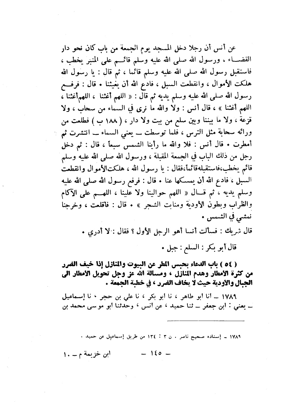 1789 - نا عَلِيُّ بْنُ حُجْرٍ، نا إِسْمَاعِيلُ يَعْنِي ابْنَ جَعْفَرٍ، ثنا حُمَيْدٌ، عَنْ أَنَسٍ، وَحَدَّثَنَا أَبُو مُوسَى مُحَمَّدُ بْنُ الْمُثَنَّى , وَعَلِيُّ بْنُ الْحُسَيْنِ الدِّرْهَمِيُّ قَالَا: ثنا خَالِدٌ وَهُوَ ابْنُ الْحَارِثِ , ثنا حُمَيْدٌ قَالَ: سُئِلَ أَنَسٌ: هَلْ كَانَ نَبِيُّ اللَّهِ صَلَّى اللهُ عَلَيْهِ وَسَلَّمَ يَرْفَعُ يَدَيْهِ؟ قَالَ: قِيلَ يَوْمَ الْجُمُعَةِ: يَا رَسُولَ اللَّهِ , قَحَطَ الْمَطَرُ , وَأَجْدَبَتِ الْأَرْضُ , وَهَلَكَ الْمَالُ , قَالَ: فَرَفَعَ يَدَيْهِ حَتَّى رَأَيْتُ بَيَاضَ إِبْطَيْهِ , فَاسْتَسْقَى وَمَا نَرَى فِي السَّمَاءِ سَحَابَةً , قَالَ: فَمَا قَضَيْنَا الصَّلَاةَ حَتَّى إِنَّ الشَّابَّ الْقَرِيبَ الْمَنْزِلِ لَيُهِمُّهُ الرُّجُوعُ إِلَى أَهْلِهِ مِنْ شِدَّةِ الْمَطَرِ , فَدَامَتْ جُمُعَةً , فَقَالُوا: يَا رَسُولَ اللَّهِ , تَهَدَّمَتِ الْبُيُوتُ , وَاحْتُبِسَتِ الرُّكْبَانُ , فَتَبَسَّمَ رَسُولُ اللَّهِ صَلَّى اللهُ عَلَيْهِ وَسَلَّمَ، فَقَالَ بِيَدِهِ: «§اللَّهُمَّ حَوَالَيْنَا , وَلَا عَلَيْنَا» , فَكُشِطَتْ عَنِ الْمَدِينَةِ. " هَذَا لَفْظُ حَدِيثِ خَالِدِ بْنِ الْحَارِثِ، غَيْرَ أَنَّ أَبَا مُوسَى قَالَ: قَحَطَ الْمَطَرُ "K1789 - قال الألباني: إسناده صحيح