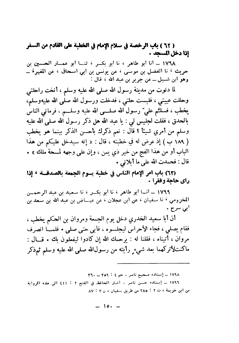 1799 - نا سَعِيدُ بْنُ عَبْدِ الرَّحْمَنِ الْمَخْزُومِيُّ، نا سُفْيَانُ، عَنِ ابْنِ عَجْلَانَ، عَنْ عِيَاضِ بْنِ عَبْدِ اللَّهِ بْنِ سَعْدِ بْنِ أَبِي سَرْحٍ، أَنَّ أَبَا سَعِيدٍ الْخُدْرِيَّ، دَخَلَ يَوْمَ الْجُمُعَةِ وَمَرْوَانُ بْنُ الْحَكَمِ يَخْطُبُ , فَقَامَ يُصَلِّي , فَجَاءَ الْأَحْرَاسُ لِيُجْلِسُوهُ , فَأَبَى حَتَّى صَلَّى , فَلَمَّا انْصَرَفَ مَرْوَانُ أَتَيْنَاهُ , فَقُلْنَا لَهُ: يَرْحَمُكَ اللَّهُ , إِنْ كَادُوا لَيَفْعَلُونَ بِكَ قَالَ: مَا كُنْتُ لِأَتْرُكَهُمَا بَعْدَ شَيْءٍ رَأَيْتُهُ مِنْ رَسُولِ اللَّهِ صَلَّى اللهُ عَلَيْهِ وَسَلَّمَ. ثُمَّ ذَكَرَ أَنَّ رَجُلًا جَاءَ يَوْمَ الْجُمُعَةِ وَرَسُولُ اللَّهِ صَلَّى اللهُ عَلَيْهِ وَسَلَّمَ يَخْطُبُ فِي هَيْئَةٍ بَذَّةٍ , فَأَمَرَ رَسُولُ اللَّهِ صَلَّى اللهُ عَلَيْهِ وَسَلَّمَ أَنْ يَتَصَدَّقُوا , فَمَا لَقَوْا ثِيَابًا , فَأَمَرَ لَهُ بِثَوْبَيْنِ , وَأَمَرَهُ فَصَلَّى رَكْعَتَيْنِ , وَرَسُولُ اللَّهِ صَلَّى اللهُ عَلَيْهِ وَسَلَّمَ يَخْطُبُ , ثُمَّ جَاءَ يَوْمُ الْجُمُعَةِ الْأُخْرَى , وَرَسُولُ اللَّهِ صَلَّى اللهُ عَلَيْهِ وَسَلَّمَ يَخْطُبُ فَأَمَرَ رَسُولُ اللَّهِ صَلَّى اللهُ عَلَيْهِ وَسَلَّمَ أَنْ يَتَصَدَّقُوا , فَأَلْقَى رَجُلٌ أَحَدَ ثَوْبَيْهِ , فَصَاحَ لَهُ رَسُولُ اللَّهِ صَلَّى اللهُ عَلَيْهِ وَسَلَّمَ , أَوْ زَجَرَهُ , وَقَالَ: «خُذْ ثَوْبَكَ» , ثُمَّ قَالَ رَسُولُ اللَّهِ صَلَّى اللهُ عَلَيْهِ وَسَلَّمَ: «إِنَّ §هَذَا دَخَلَ فِي هَيْئَةٍ بَذَّةٍ , فَأَمَرْتُ النَّاسَ أَنْ يَتَصَدَّقُوا , فَمَا لَقَوْا ثِيَابًا , فَأَمَرْتُ لَهُ بِثَوْبَيْنِ , ثُمَّ دَخَلَ الْيَوْمَ فَأَمَرْتُ أَنْ يَتَصَدَّقُوا , فَأَلْقَى هَذَا أَحَدَ ثَوْبَيْهِ» , ثُمَّ أَمَرَهُ رَسُولُ اللَّهِ صَلَّى اللهُ عَلَيْهِ وَسَلَّمَ أَنْ يُصَلِّيَ رَكْعَتَيْنِK1799 - قال الألباني: إسناده حسن
