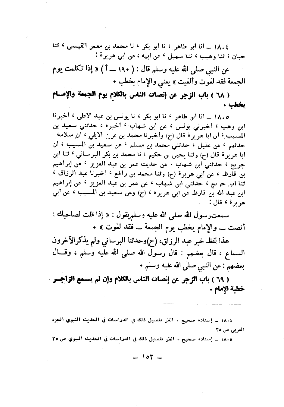1804 - نا مُحَمَّدُ بْنُ مَعْمَرٍ الْقَيْسِيُّ، ثنا حَبَّانُ، ثنا وُهَيْبٌ، ثنا سُهَيْلٌ، عَنْ أَبِيهِ، عَنْ أَبِي هُرَيْرَةَ، عَنِ النَّبِيِّ صَلَّى اللهُ عَلَيْهِ وَسَلَّمَ قَالَ: «§إِذَا تَكَلَّمْتَ يَوْمَ الْجُمُعَةِ فَقَدْ لَغَوْتَ , وَأُلْغِيَتْ» . يَعْنِي وَالْإِمَامُ يَخْطُبُK1804 - قال الأعظمي: إسناده صحيح