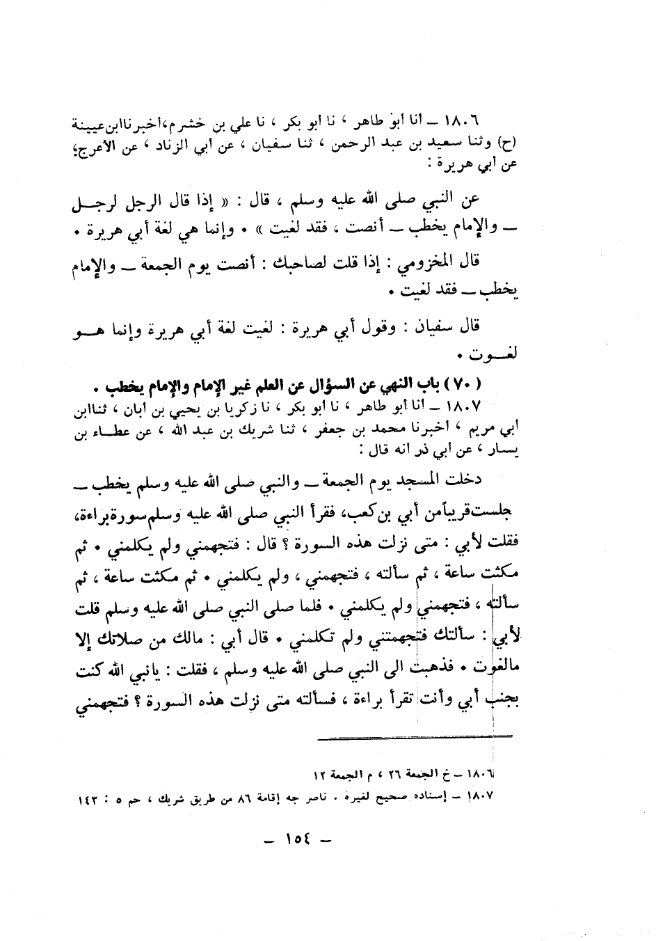 1807 - نا زَكَرِيَّا بْنُ يَحْيَى بْنِ أَبَانَ، ثنا ابْنُ أَبِي مَرْيَمَ، أَخْبَرَنَا مُحَمَّدُ بْنُ جَعْفَرٍ، ثنا شَرِيكُ بْنُ عَبْدِ اللَّهِ، عَنْ عَطَاءِ بْنِ يَسَارٍ، عَنْ أَبِي ذَرٍّ أَنَّهُ قَالَ: دَخَلْتُ الْمَسْجِدَ يَوْمَ الْجُمُعَةِ وَالنَّبِيُّ صَلَّى اللهُ عَلَيْهِ وَسَلَّمَ يَخْطُبُ , فَجَلَسْتُ قَرِيبًا مِنْ أُبَيِّ بْنِ كَعْبٍ , فَقَرَأَ النَّبِيُّ صَلَّى اللهُ عَلَيْهِ وَسَلَّمَ سُورَةَ بَرَاءَةَ , فَقُلْتُ لِأُبَيٍّ: مَتَى نَزَلَتْ هَذِهِ السُّورَةُ؟ قَالَ: فَتَجَهَّمَنِي وَلَمْ يُكَلِّمْنِي , ثُمَّ مَكَثْتُ سَاعَةً , ثُمَّ سَأَلْتُهُ فَتَجَهَّمَنِي وَلَمْ يُكَلِّمْنِي , ثُمَّ مَكَثْتُ سَاعَةً , ثُمَّ سَأَلْتُهُ فَتَجَهَّمَنِي وَلَمْ يُكَلِّمْنِي , فَلَمَّا صَلَّى النَّبِيُّ صَلَّى اللهُ عَلَيْهِ وَسَلَّمَ، قُلْتُ لِأُبَيٍّ: سَأَلْتُكَ فَتَجَهَّمْتَنِي وَلَمْ تُكَلِّمْنِي , قَالَ أُبَيُّ: مَا لَكَ مِنْ صَلَاتِكَ إِلَّا مَا لَغَوْتَ , فَذَهَبْتُ إِلَى النَّبِيِّ صَلَّى اللهُ عَلَيْهِ وَسَلَّمَ، فَقُلْتُ: يَا نَبِيَّ اللَّهِ، كُنْتُ بِجَنْبِ أُبَيٍّ , وَأَنْتَ تَقْرَأُ بَرَاءَةَ , فَسَأَلْتُهُ: مَتَى نَزَلَتْ هَذِهِ السُّورَةُ؟ فَتَجَهَّمَنِي وَلَمْ يُكَلِّمْنِي , ثُمَّ قَالَ: §مَا لَكَ مِنْ صَلَاتِكَ إِلَّا مَا لَغَوْتَ قَالَ النَّبِيُّ صَلَّى اللهُ عَلَيْهِ وَسَلَّمَ: «صَدَقَ أُبَيٌّ» -[155]-.