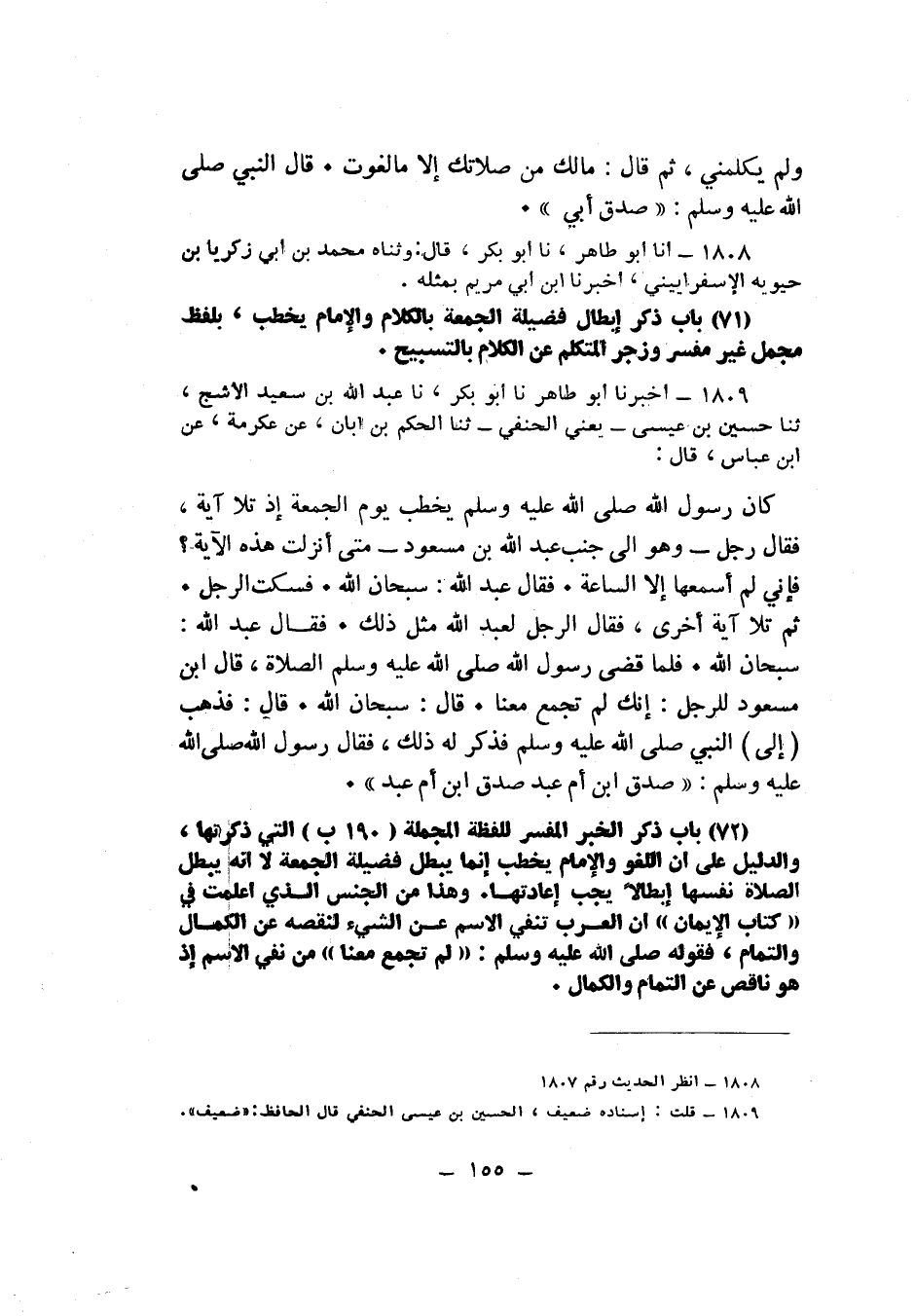 §بَابُ ذِكْرِ الْخَبَرِ الْمُفَسِّرِ لِلَّفْظَةِ الْمُجْمَلَةِ الَّتِي ذَكَرْتُهَا، وَالدَّلِيلِ عَلَى أَنَّ اللَّغْوَ وَالْإِمَامُ يَخْطُبُ إِنَّمَا يُبْطِلُ فَضِيلَةَ الْجُمُعَةِ لَا أَنَّهُ يُبْطِلُ الصَّلَاةَ نَفْسَهَا إِبْطَالًا يَجِبُ إِعَادَتُهَا، وَهَذَا مِنَ الْجِنْسِ الَّذِي أَعْلَمْتُ فِي كِتَابِ الْإِيمَانِ، أَنَّ الْعَرَبَ تَنْفِي الِاسْمَ عَنِ الشَّيْءِ لِنَقْصِهِ عَنِ الْكَمَالِ وَالتَّمَامِ، فَقَوْلُهُ صَلَّى اللهُ عَلَيْهِ وَسَلَّمَ: «لَمْ تَجْمَعْ مَعَنَا» مِنْ نَفْيِ الِاسْمِ إِذْ هُوَ نَاقِصٌ عَنِ التَّمَامِ وَالْكَمَالِ