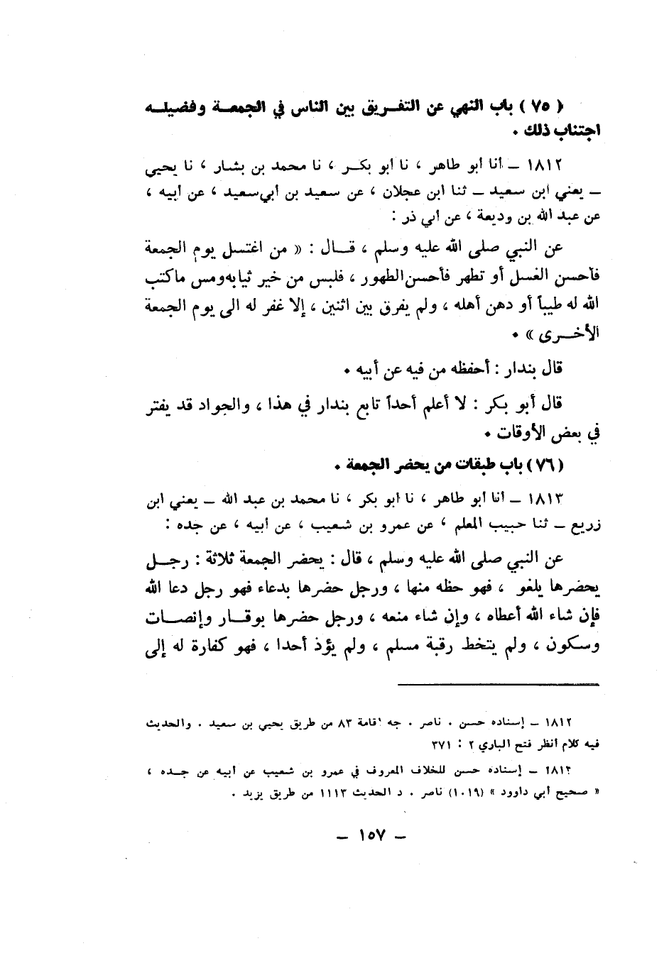 1812 - نا مُحَمَّدُ بْنُ بَشَّارٍ، نا يَحْيَى يَعْنِي بْنَ سَعِيدٍ، ثنا ابْنُ عَجْلَانَ، عَنْ سَعِيدِ بْنِ أَبِي سَعِيدٍ، عَنْ أَبِيهِ، عَنْ عَبْدِ اللَّهِ بْنِ وَدِيعَةَ، عَنْ أَبِي ذَرٍّ، عَنِ النَّبِيِّ صَلَّى اللهُ عَلَيْهِ وَسَلَّمَ قَالَ: «§مَنِ اغْتَسَلَ يَوْمَ الْجُمُعَةِ فَأَحْسَنَ الْغُسْلَ أَوْ تَطَهَّرَ فَأَحْسَنَ الطُّهُورَ فَلَبِسَ مِنْ خَيْرِ ثِيَابِهِ , وَمَسَّ مَا كَتَبَ اللَّهُ لَهُ طِيبًا , أَوْ دُهْنِ أَهْلِهِ , وَلَمْ يُفَرِّقْ بَيْنَ اثْنَيْنِ إِلَّا غُفِرَ لَهُ إِلَى يَوْمِ الْجُمُعَةِ الْأُخْرَى» . قَالَ بُنْدَارٌ: أَحْفَظُهُ مِنْ فِيهِ , عَنْ أَبِيهِ. قَالَ أَبُو بَكْرٍ: «لَا أَعْلَمُ أَحَدًا تَابَعَ بُنْدَارًا فِي هَذَا , وَالْجَوَادُ قَدْ يَفْتُرُ فِي بَعْضِ الْأَوْقَاتِ» K1812 - قال الألباني: إسناده حسن