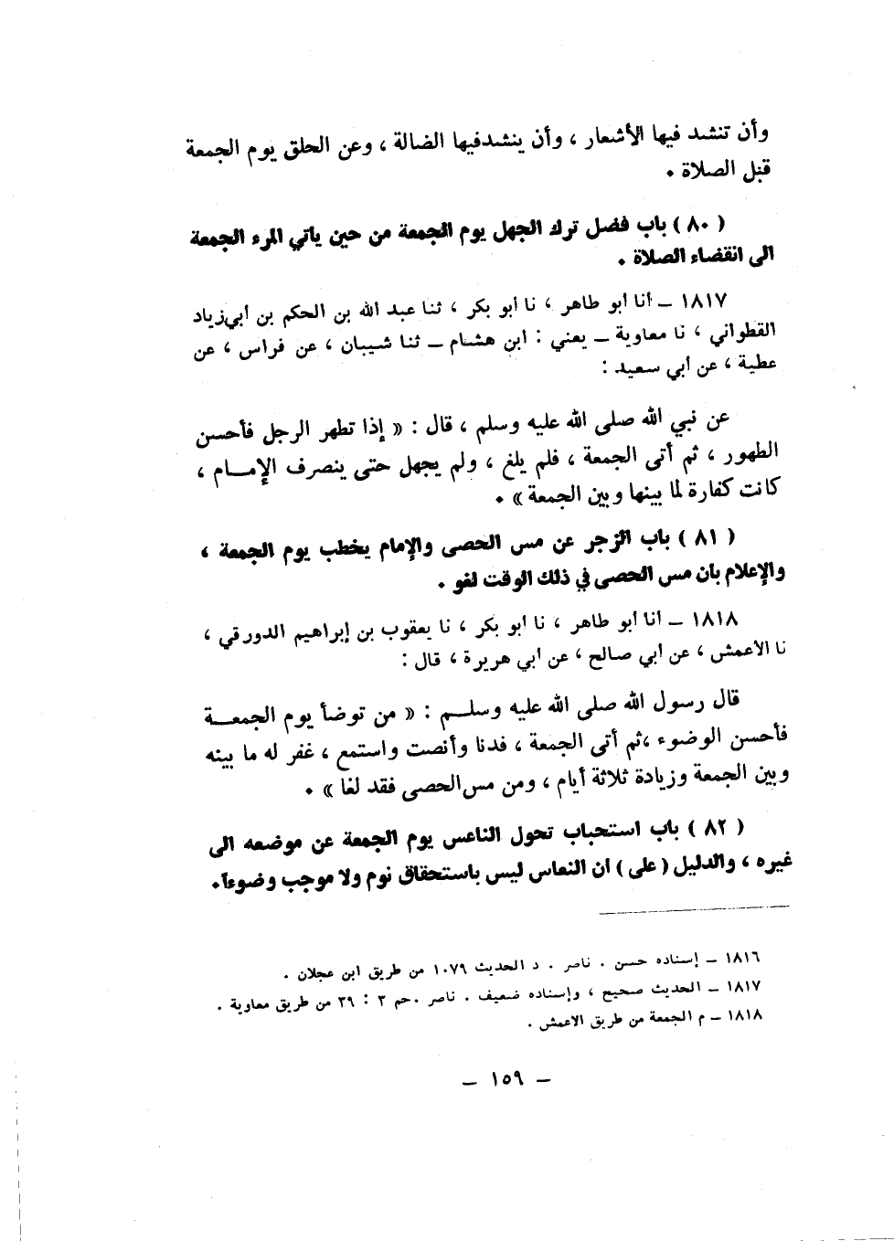 1817 - ثنا عَبْدُ اللَّهِ بْنُ الْحَكَمِ بْنِ أَبِي زِيَادٍ الْقَطَوَانِيُّ، نا مُعَاوِيَةُ يَعْنِي ابْنَ هِشَامٍ، ثنا شَيْبَانُ، عَنْ فِرَاسٍ، عَنْ عَطِيَّةَ، عَنْ أَبِي سَعِيدٍ، عَنْ نَبِيِّ اللَّهِ صَلَّى اللهُ عَلَيْهِ وَسَلَّمَ قَالَ: «§إِذَا تَطَهَّرَ الرَّجُلُ فَأَحْسَنَ الطُّهُورَ، ثُمَّ أَتَى الْجُمُعَةَ فَلَمْ يَلْغُ وَلَمْ يَجْهَلْ حَتَّى يَنْصَرِفَ الْإِمَامُ كَانَتْ كَفَّارَةً لِمَا بَيْنَهَا وَبَيْنَ الْجُمُعَةِ» K1817 - قال الألباني: الحديث صحيح وإسناده ضعيف