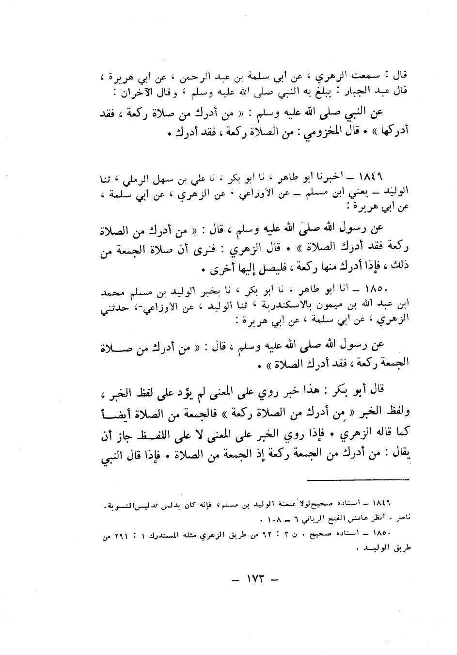 1850 - نا بِخَبَرِ الْوَلِيدِ بْنِ مُسْلِمٍ مُحَمَّدُ بْنُ عَبْدِ اللَّهِ بْنِ مَيْمُونٍ بِالْإِسْكَنْدَرِيَّةِ، ثنا الْوَلِيدُ، عَنِ الْأَوْزَاعِيِّ، حَدَّثَنِي الزُّهْرِيُّ، عَنْ أَبِي سَلَمَةَ، عَنْ أَبِي هُرَيْرَةَ، عَنْ رَسُولِ اللَّهِ صَلَّى اللهُ عَلَيْهِ وَسَلَّمَ قَالَ: «§مَنْ أَدْرَكَ مِنْ صَلَاةِ الْجُمُعَةِ رَكْعَةً فَقَدْ أَدْرَكَ الصَّلَاةَ» قَالَ أَبُو بَكْرٍ: هَذَا خَبَرٌ رُوِيَ عَلَى الْمَعْنَى، لَمْ يُؤَدَّ عَلَى لَفْظِ الْخَبَرِ، وَلَفْظُ الْخَبَرِ: «مَنْ أَدْرَكَ مِنَ الصَّلَاةِ رَكْعَةً فَالْجُمُعَةُ مِنَ الصَّلَاةِ أَيْضًا» ، كَمَا قَالَهُ الزُّهْرِيُّ، فَإِذَا رُوِيَ الْخَبَرُ عَلَى الْمَعْنَى لَا عَلَى اللَّفْظِ جَازَ أَنْ يُقَالَ: مَنْ أَدْرَكَ مِنَ الْجُمُعَةِ رَكْعَةً، إِذِ الْجُمُعَةُ مِنَ الصَّلَاةِ، فَإِذَا قَالَ النَّبِيُّ صَلَّى اللهُ عَلَيْهِ وَسَلَّمَ: «مَنْ أَدْرَكَ مِنَ الصَّلَاةِ رَكْعَةً فَقَدْ أَدْرَكَ الصَّلَاةَ» كَانَتِ الصَّلَوَاتُ كُلُّهَا دَاخِلَةً فِي هَذَا الْخَبَرِ، الْجُمُعَةُ وَغَيْرُهَا مِنَ الصَّلَوَاتِ، وَقَدْ رَوَى هَذَا الْخَبَرَ أَيْضًا بِمِثْلِ هَذَا اللَّفْظِ أُسَامَةُ بْنُ زَيْدٍ اللَّيْثِيُّ، عَنِ ابْنِ شِهَابٍK1850 - قال الأعظمي: إسناده صحيح