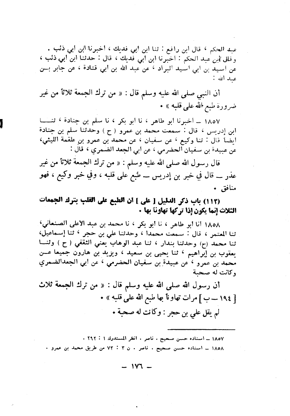 1858 - نا مُحَمَّدُ بْنُ عَبْدِ الْأَعْلَى الصَّنْعَانِيُّ، ثنا الْمُعْتَمِرُ قَالَ: سَمِعْتُ مُحَمَّدًا، وَحَدَّثَنَا عَلِيُّ بْنُ حُجْرٍ، ثنا إِسْمَاعِيلُ، ثنا مُحَمَّدٌ، ح وَحَدَّثَنَا بُنْدَارٌ، ثنا عَبْدُ الْوَهَّابِ، يَعْنِي الثَّقَفِيَّ، ح وَثنا يَعْقُوبُ بْنُ إِبْرَاهِيمَ، ثنا يَحْيَى بْنُ سَعِيدٍ، وَيَزِيدُ بْنُ هَارُونَ جَمِيعًا عَنْ مُحَمَّدِ بْنِ عَمْرٍو، عَنْ عُبَيْدَةَ بْنِ سُفْيَانَ الْحَضْرَمِيِّ، عَنْ أَبِي الْجَعْدِ الضَّمْرِيِّ، وَكَانَتْ لَهُ صُحْبَةٌ أَنَّ رَسُولَ اللَّهِ صَلَّى اللهُ عَلَيْهِ وَسَلَّمَ قَالَ: «§مَنْ تَرَكَ الْجُمُعَةَ ثَلَاثَ مَرَّاتٍ تَهَاوُنًا بِهَا، طَبَعَ اللَّهُ عَلَى قَلْبِهِ» لَمْ يَقُلْ عَلِيُّ بْنُ حُجْرٍ: وَكَانَتْ لَهُ صُحْبَةٌK1858 - قال الألباني: إسناده حسن صحيح