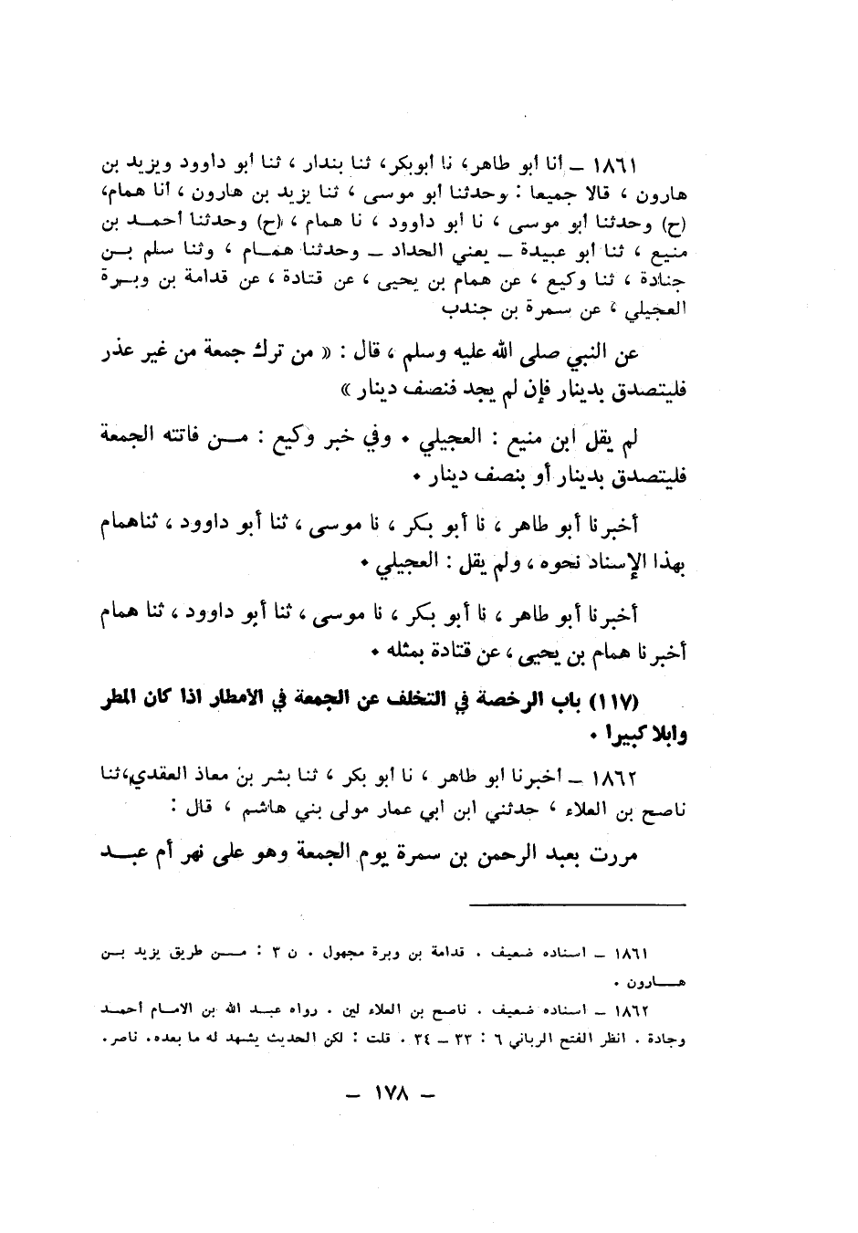 1862 - ثنا بِشْرُ بْنُ مُعَاذٍ الْعَقَدِيُّ، ثنا نَاصِحُ بْنُ الْعَلَاءِ، حَدَّثَنِي ابْنُ أَبِي عَمَّارٍ مَوْلَى بَنِي هَاشِمٍ قَالَ: مَرَرْتُ بِعَبْدِ الرَّحْمَنِ بْنِ سَمُرَةَ يَوْمَ الْجُمُعَةِ وَهُوَ عَلَى نَهَرِ أُمِّ عَبْدِ اللَّهِ وَهُوَ يَسِيلُ الْمَاءِ عَلَى غِلْمَانِهِ وَمَوَالِيهِ، فَقُلْتُ لَهُ: يَا أَبَا سَعِيدٍ الْجُمُعَةَ فَقَالَ: قَالَ رَسُولُ اللَّهِ صَلَّى اللهُ عَلَيْهِ وَسَلَّمَ: «§إِذَا كَانَ الْمَطَرُ وَابِلًا فَصَلُّوا فِي رِحَالِكُمْ» K1862 - قال الأعظمي: إسناده ضعيف ناصح بن العلاء فيه لين