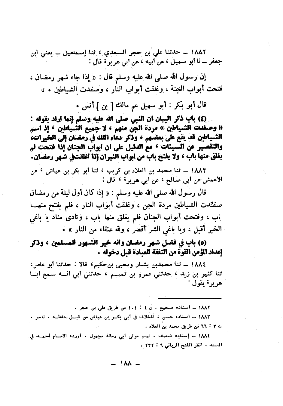 1882 - حَدَّثَنَا عَلِيُّ بْنُ حُجْرٍ السَّعْدِيُّ، ثنا إِسْمَاعِيلُ يَعْنِي ابْنَ جَعْفَرٍ، نا أَبُو سُهَيْلٍ، عَنْ أَبِيهِ، عَنْ أَبِي هُرَيْرَةَ قَالَ: إِنَّ رَسُولَ اللَّهِ صَلَّى اللهُ عَلَيْهِ وَسَلَّمَ قَالَ: «§إِذَا جَاءَ شَهْرُ رَمَضَانَ فُتِحَتْ أَبْوَابُ الْجَنَّةِ، وَغُلِّقَتْ أَبْوَابُ النَّارِ، وَصُفِّدَتِ الشَّيَاطِينُ» قَالَ أَبُو بَكْرٍ: «أَبُو سُهَيْلٍ عَمُّ مَالِكِ بْنِ أَنَسٍ» K1882 - قال الأعظمي: إسناده صحيح