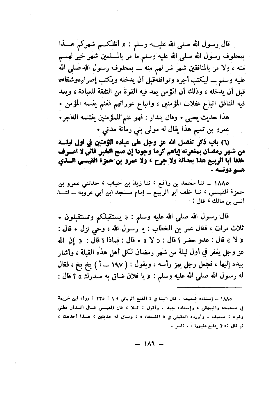 1885 - ثنا مُحَمَّدُ بْنُ رَافِعٍ، ثنا زَيْدُ بْنُ حُبَابٍ، حَدَّثَنِي عَمْرُو بْنُ حَمْزَةَ الْقَيْسِيُّ، ثنا خَلَفٌ أَبُو الرَّبِيعِ، إِمَامُ مَسْجِدِ ابْنِ أَبِي عَرُوبَةَ، ثنا أَنَسُ بْنُ مَالِكٍ قَالَ: قَالَ رَسُولُ اللَّهِ صَلَّى اللهُ عَلَيْهِ وَسَلَّمَ: «يَسْتَقْبِلُكُمْ وَتَسْتَقْبِلُونَ» - ثَلَاثَ مَرَّاتٍ - فَقَالَ عُمَرُ بْنُ الْخَطَّابِ: يَا رَسُولَ اللَّهِ، وَحْيٌ نَزَلَ؟ قَالَ: «لَا» قَالَ: عَدُوٌّ حَضَرَ؟ قَالَ: «لَا» قَالَ: فَمَاذَا؟ قَالَ: «إِنَّ §اللَّهَ عَزَّ وَجَلَّ يَغْفِرُ فِي أَوَّلِ لَيْلَةٍ مِنْ شَهْرِ رَمَضَانَ لِكُلِّ أَهْلِ هَذِهِ الْقِبْلَةِ» ، وَأَشَارَ بِيَدِهِ إِلَيْهَا، فَجَعَلَ رَجُلٌ يَهُزُّ رَأْسَهُ وَيَقُولُ: بَخٍ بَخٍ فَقَالَ لَهُ رَسُولُ اللَّهِ صَلَّى اللهُ عَلَيْهِ وَسَلَّمَ: «يَا فُلَانُ، ضَاقَ بِهِ صَدْرُكَ؟» قَالَ: لَا، وَلَكِنْ ذَكَرْتُ الْمُنَافِقَ، فَقَالَ: «إِنَّ الْمُنَافِقِينَ هُمُ الْكَافِرُونَ، وَلَيْسَ لِكَافِرٍ مِنْ ذَلِكِ شَيْءٌ» K1885 - قال: إسناده ضعيف. قال البنا في الفتح الرباني: رواه ابن خزيمة في صحيحه والبيهقي بسند جيد