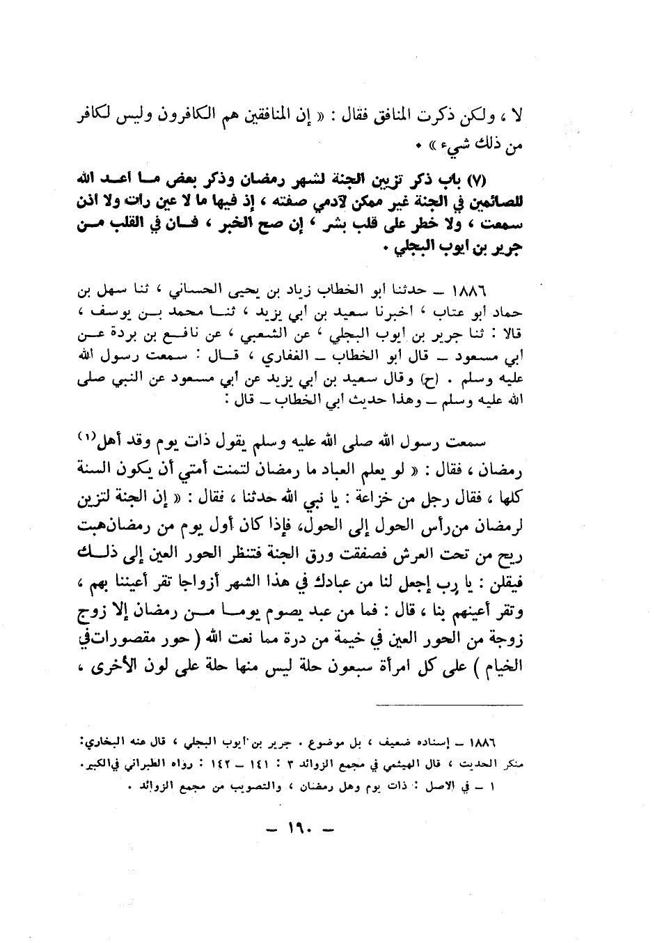 §بَابُ ذِكْرِ تَزْيِينِ الْجَنَّةِ لِشَهْرِ رَمَضَانَ «وَذِكْرِ بَعْضِ مَا أَعَدَّ اللَّهُ لِلصَّائِمِينَ فِي الْجَنَّةِ غَيْرِ مُمْكِنٍ لِآدَمِيٍّ صِفَتِهِ، إِذْ فِيهَا مَا لَا عَيْنٌ رَأَتْ، وَلَا أُذُنٌ سَمِعَتْ، وَلَا خَطَرَ عَلَى قَلْبِ بِشْرٍ، إِنْ صَحَّ الْخَبَرُ؛ فَإِنَّ فِي الْقَلْبِ مِنْ جَرِيرِ بْنِ أَيُّوبَ الْبَجَلِيِّ»