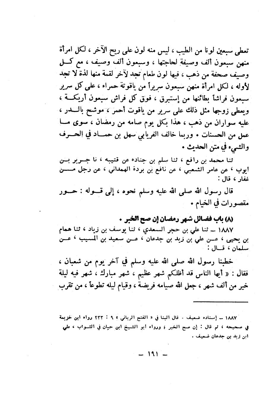 1887 - ثنا عَلِيُّ بْنُ حُجْرٍ السَّعْدِيُّ، ثنا يُوسُفُ بْنُ زِيَادٍ، ثنا هَمَّامُ بْنُ يَحْيَى، عَنْ عَلِيِّ بْنِ زَيْدِ بْنِ جُدْعَانَ، عَنْ سَعِيدِ بْنِ الْمُسَيِّبِ، عَنْ سَلْمَانَ قَالَ: خَطَبَنَا رَسُولُ اللَّهِ صَلَّى اللهُ عَلَيْهِ وَسَلَّمَ فِي آخِرِ يَوْمٍ مِنْ شَعْبَانَ فَقَالَ: «أَيُّهَا النَّاسُ قَدْ §أَظَلَّكُمْ شَهْرٌ عَظِيمٌ، شَهْرٌ مُبَارَكٌ، شَهْرٌ فِيهِ لَيْلَةٌ خَيْرٌ مِنْ أَلْفِ شَهْرٍ، جَعَلَ اللَّهُ صِيَامَهُ فَرِيضَةً، وَقِيَامَ لَيْلِهِ تَطَوُّعًا، مَنْ تَقَرَّبَ فِيهِ بِخَصْلَةٍ مِنَ الْخَيْرِ، كَانَ كَمَنْ أَدَّى فَرِيضَةً فِيمَا سِوَاهُ، وَمَنْ أَدَّى فِيهِ فَرِيضَةً كَانَ كَمَنْ أَدَّى سَبْعِينَ فَرِيضَةً فِيمَا سِوَاهُ، وَهُوَ شَهْرُ الصَّبْرِ، وَالصَّبْرُ ثَوَابُهُ الْجَنَّةُ، وَشَهْرُ الْمُوَاسَاةِ، وَشَهْرٌ يَزْدَادُ فِيهِ رِزْقُ الْمُؤْمِنِ، مَنْ فَطَّرَ فِيهِ صَائِمًا كَانَ مَغْفِرَةً لِذُنُوبِهِ وَعِتْقَ رَقَبَتِهِ مِنَ النَّارِ، وَكَانَ لَهُ مِثْلُ أَجْرِهِ مِنْ غَيْرِ أَنْ يَنْتَقِصَ مِنْ أَجْرِهِ شَيْءٌ» ، قَالُوا: لَيْسَ كُلُّنَا نَجِدُ مَا يُفَطِّرُ الصَّائِمَ، فَقَالَ: " يُعْطِي اللَّهُ هَذَا الثَّوَابَ مَنْ فَطَّرَ صَائِمًا عَلَى تَمْرَةٍ، أَوْ شَرْبَةِ مَاءٍ، أَوْ مَذْقَةِ لَبَنٍ، وَهُوَ شَهْرٌ أَوَّلُهُ رَحْمَةٌ، وَأَوْسَطُهُ مَغْفِرَةٌ، وَآخِرُهُ عِتْقٌ مِنَ النَّارِ، مَنْ خَفَّفَ عَنْ مَمْلُوكِهِ غَفَرَ اللَّهُ لَهُ، وَأَعْتَقَهُ مِنَ النَّارِ، وَاسْتَكْثِرُوا فِيهِ مِنْ أَرْبَعِ خِصَالٍ: خَصْلَتَيْنِ تُرْضُونَ بِهِمَا رَبَّكُمْ، وَخَصْلَتَيْنِ لَا غِنًى بِكُمْ عَنْهُمَا، فَأَمَّا الْخَصْلَتَانِ اللَّتَانِ تُرْضُونَ بِهِمَا رَبَّكُمْ: فَشَهَادَةُ أَنْ لَا إِلَهَ إِلَّا اللَّهُ، وَتَسْتَغْفِرُونَهُ، وَأَمَّا اللَّتَانِ لَا غِنًى بِكُمْ عَنْهمَا: فَتُسْأَلُونَ اللَّهَ الْجَنَّةَ، وَتَعُوذُونَ بِهِ مِنَ النَّارِ، وَمَنْ أَشْبَعَ فِيهِ صَائِمًا سَقَاهُ اللَّهُ مِنْ حَوْضِي شَرْبَةً لَا يَظْمَأُ حَتَّى يَدْخُلَ الْجَنَّةَ "K1887 - قال الأعظمي: إسناده ضعيف علي بن زيد بن جدعان ضعيف