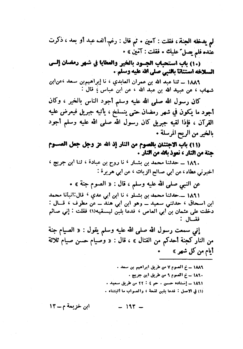 1891 - حَدَّثَنَا مُحَمَّدُ بْنُ بَشَّارٍ، نا ابْنُ أَبِي عَدِيٍّ قَالَ: أَنْبَأَنَا مُحَمَّدُ بْنُ إِسْحَاقَ، حَدَّثَنِي سَعِيدٌ وَهُوَ ابْنُ أَبِي هِنْدَ، عَنْ مُطَرِّفٍ قَالَ: دَخَلْتُ عَلَى عُثْمَانَ بْنِ أَبِي الْعَاصِ، فَدَعَا بِلَبَنٍ لِيَسْقِيَهُ، فَقُلْتُ: إِنِّي صَائِمٌ، فَقَالَ: إِنِّي سَمِعْتُ رَسُولَ اللَّهِ صَلَّى اللهُ عَلَيْهِ وَسَلَّمَ يَقُولُ: «§الصِّيَامُ جُنَّةٌ مِنَ النَّارِ، كَجُنَّةِ أَحَدِكُمْ مِنَ الْقِتَالِ» K1891 - قال الأعظمي: إسناده حسن