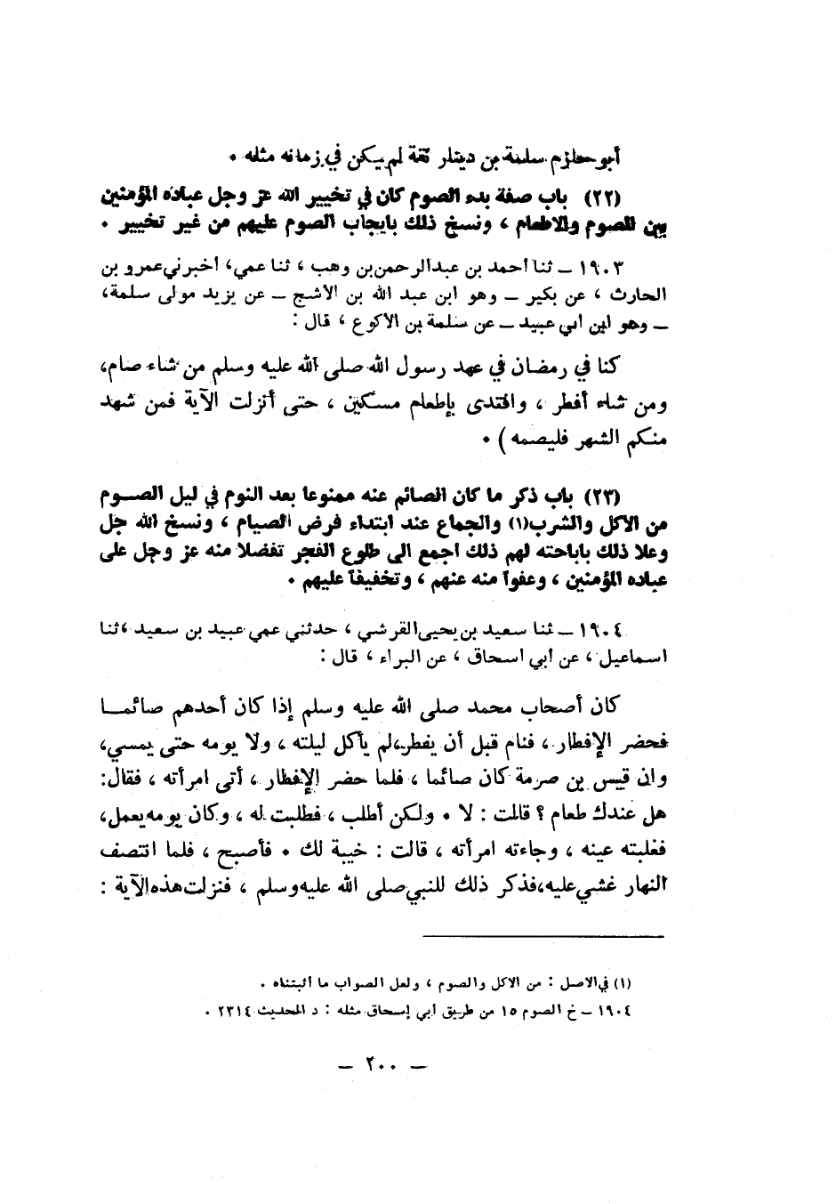 1904 - ثنا سَعِيدُ بْنُ يَحْيَى الْقُرَشِيُّ، حَدَّثَنِي عَمِّي عُبَيْدُ بْنُ سَعِيدٍ، ثنا إِسْمَاعِيلُ، عَنْ أَبِي إِسْحَاقَ، عَنِ الْبَرَاءِ قَالَ: كَانَ أَصْحَابُ مُحَمَّدٍ صَلَّى اللهُ عَلَيْهِ وَسَلَّمَ إِذَا كَانَ أَحَدُهُمْ صَائِمًا، فَحَضَرَ الْإِفْطَارَ فَنَامَ قَبْلَ أَنْ يُفْطِرَ لَمْ يَأْكُلْ لَيْلَتَهُ وَلَا يَوْمَهُ حَتَّى يُمْسِيَ، وَإِنَّ قَيْسَ بْنَ صِرْمَةَ كَانَ صَائِمًا، فَلَمَّا حَضَرَ الْإِفْطَارُ أَتَى امْرَأَتَهُ، فَقَالَ: هَلْ عِنْدَكِ طَعَامٌ؟ قَالَتْ: لَا، وَلَكِنْ أَطْلُبُ، فَطَلَبَتْ لَهُ وَكَانَ يَوْمَهُ يَعْمَلُ، فَغَلَبَتْهُ عَيْنُهُ وَجَاءَتِ امْرَأَتُهُ قَالَتْ: خَيْبَةً لَكَ، فَأَصْبَحَ، فَلَمَّا انْتَصَفَ النَّهَارُ غُشِيَ عَلَيْهِ، فَذَكَرَ ذَلِكَ النَّبِيُّ صَلَّى اللهُ عَلَيْهِ وَسَلَّمَ، فَنَزَلَتْ هَذِهِ الْآيَةُ: " {§أُحِلَّ لَكُمْ لَيْلَةَ الصِّيَامُ الرَّفَثُ إِلَى نِسَائِكُمْ} [البقرة: 187] فَفَرِحُوا بِهَا فَرَحًا شَدِيدًا، فَقَالَ: {كُلُوا وَاشْرَبُوا حَتَّى يَتَبَيَّنَ لَكُمُ الْخَيْطُ الْأَبْيَضُ مِنَ الْخَيْطِ الْأَسْوَدِ مِنَ الْفَجْرِ} [البقرة: 187] "