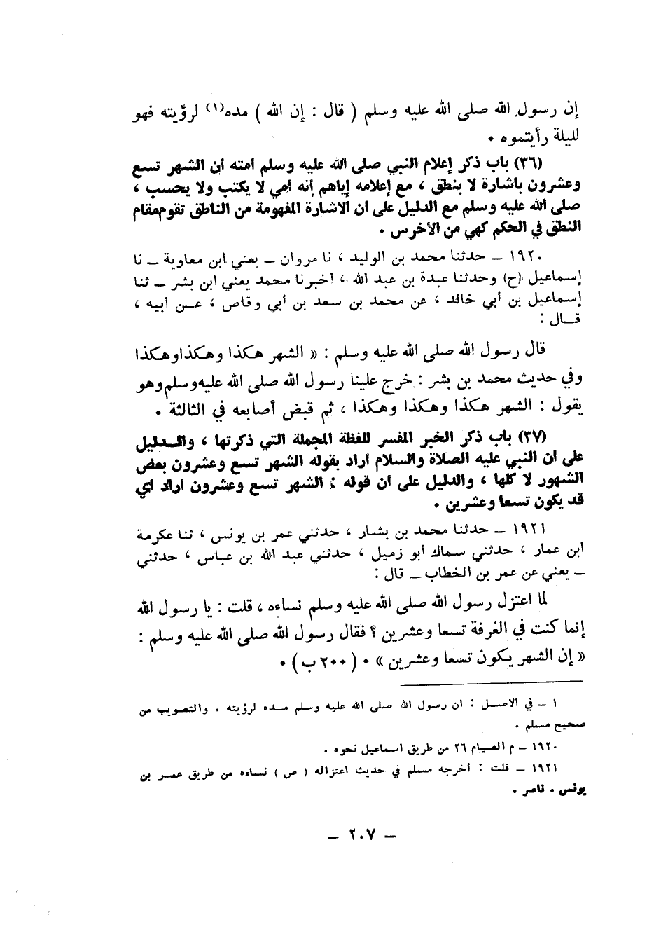 1921 - حَدَّثَنَا مُحَمَّدُ بْنُ بَشَّارٍ، حَدَّثَنِي عُمَرُ بْنُ يُونُسَ، ثنا عِكْرِمَةُ بْنُ عَمَّارٍ، حَدَّثَنِي سِمَاكٌ أَبُو زُمَيْلٍ، حَدَّثَنِي عَبْدُ اللَّهِ بْنُ عَبَّاسٍ، حَدَّثَنِي - يَعْنِي - عَنْ عُمَرَ بْنِ الْخَطَّابِ قَالَ: لَمَّا اعْتَزَلَ رَسُولُ اللَّهِ صَلَّى اللهُ عَلَيْهِ وَسَلَّمَ نِسَاءَهُ , قُلْتُ: يَا رَسُولَ اللَّهِ , إِنَّمَا كُنْتَ فِي الْغُرْفَةِ تِسْعًا وَعِشْرِينَ , فَقَالَ رَسُولُ اللَّهِ صَلَّى اللهُ عَلَيْهِ وَسَلَّمَ: «إِنَّ §الشَّهْرَ يَكُونُ تِسْعًا وَعِشْرِينَ»