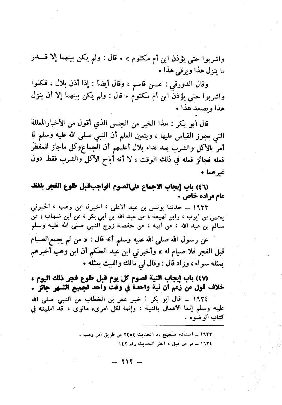 1933 - حَدَّثَنَا يُونُسُ بْنُ عَبْدِ الْأَعْلَى، أَخْبَرَنَا ابْنُ وَهْبٍ، أَخْبَرَنِي يَحْيَى بْنُ أَيُّوبَ، وَابْنُ لَهِيعَةَ , عَنْ عَبْدِ اللَّهِ بْنِ أَبِي بَكْرٍ، عَنِ ابْنِ شِهَابٍ، عَنْ سَالِمِ بْنِ عَبْدِ اللَّهِ، عَنْ أَبِيهِ، عَنْ حَفْصَةَ زَوْجِ النَّبِيِّ صَلَّى اللهُ عَلَيْهِ وَسَلَّمَ , عَنْ رَسُولِ اللَّهِ صَلَّى اللهُ عَلَيْهِ وَسَلَّمَ، أَنَّهُ قَالَ: «§مَنْ لَمْ يَجْمَعِ الصِّيَامَ قَبْلَ الْفَجْرِ فَلَا صِيَامَ لَهُ» . وَأَخْبَرَنِي ابْنُ عَبْدِ الْحَكَمِ , أَنَّ ابْنَ وَهْبٍ أَخْبَرَهُمْ بِمِثْلِهِ سَوَاءً، وَزَادَ: قَالَ: وَقَالَ لِي مَالِكٌ، وَاللَّيْثُ بِمِثْلِهِK1933 - قال الأعظمي: إسناده صحيح