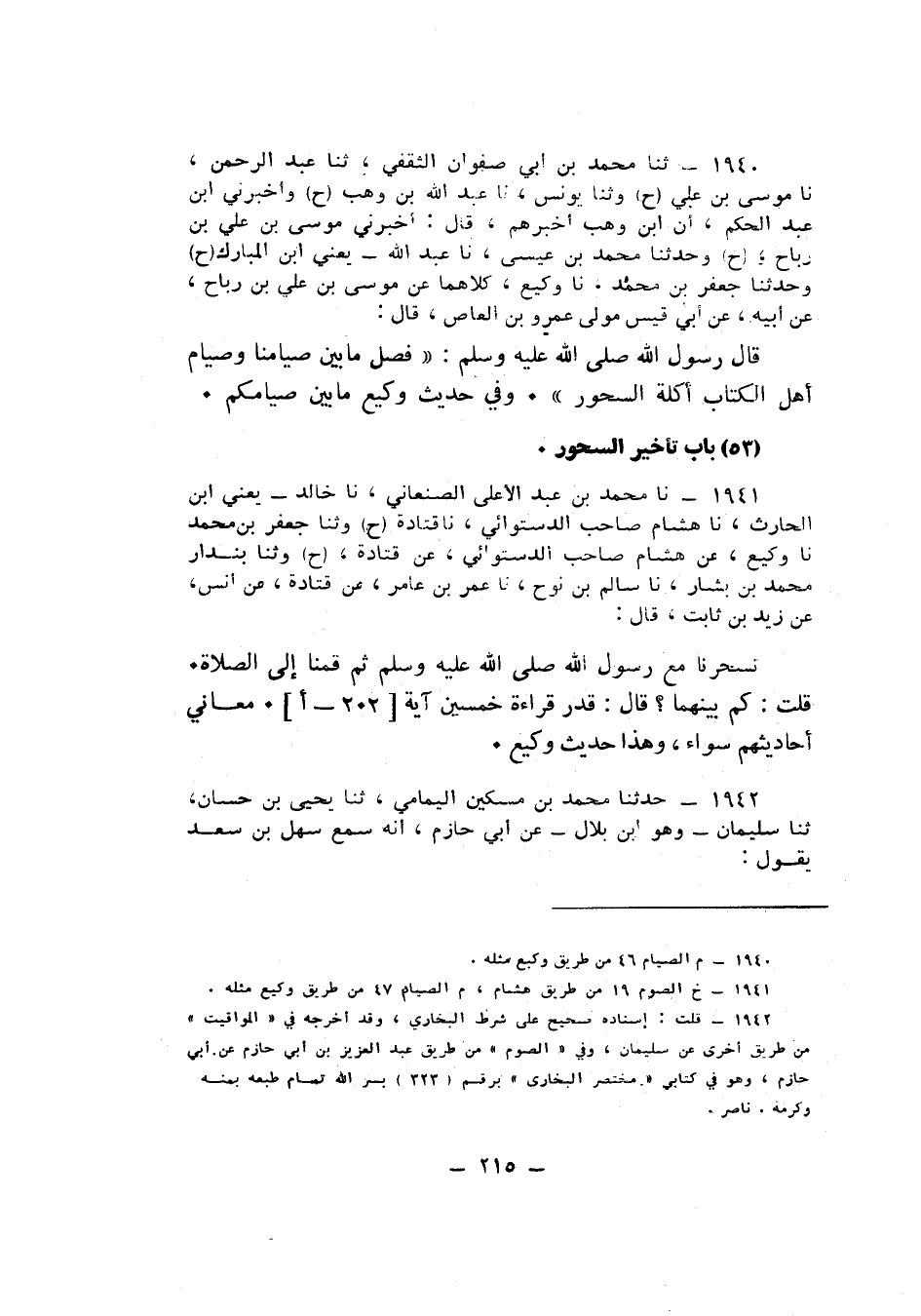 1941 - نا مُحَمَّدُ بْنُ عَبْدِ الْأَعْلَى الصَّنْعَانِيُّ، نا خَالِدٌ يَعْنِي ابْنَ الْحَارِثِ، نا هِشَامٌ صَاحِبُ الدَّسْتُوَائِيِّ، نا قَتَادَةُ، ح، وَثنا جَعْفَرُ بْنُ مُحَمَّدٍ، نا وَكِيعٌ، عَنْ هِشَامٍ صَاحِبِ الدَّسْتُوَائِيِّ , عَنْ قَتَادَةَ، ح، وَثنا بُنْدَارٌ مُحَمَّدُ بْنُ بَشَّارٍ , نا سَالِمُ بْنُ نُوحٍ، نا عُمَرُ بْنُ عَامِرٍ، عَنْ قَتَادَةَ، عَنْ أَنَسٍ، عَنْ زَيْدِ بْنِ ثَابِتٍ قَالَ: «§تَسَحَّرْنَا مَعَ رَسُولِ اللَّهِ صَلَّى اللهُ عَلَيْهِ وَسَلَّمَ , ثُمَّ قُمْنَا إِلَى الصَّلَاةِ» , قُلْتُ: كَمْ بَيْنَهُمَا؟ قَالَ: «قَدْرُ قِرَاءَةِ خَمْسِينَ آيَةً» . مَعَانِي أَحَادِيثِهِمْ سَوَاءٌ , وَهَذَا حَدِيثُ وَكِيعٍ