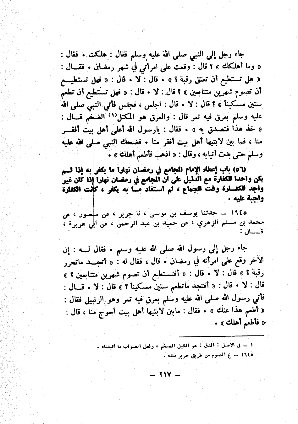 1945 - حَدَّثَنَا يُوسُفُ بْنُ مُوسَى، نا جَرِيرٌ، عَنْ مَنْصُورٍ، عَنْ مُحَمَّدِ بْنِ مُسْلِمٍ الزُّهْرِيِّ، عَنْ حُمَيْدِ بْنِ عَبْدِ الرَّحْمَنِ، عَنْ أَبِي هُرَيْرَةَ قَالَ: جَاءَ رَجُلٌ إِلَى رَسُولِ اللَّهِ صَلَّى اللهُ عَلَيْهِ وَسَلَّمَ، فَقَالَ لَهُ: إِنَّ الْآخَرَ §وَقَعَ عَلَى امْرَأَتِهِ فِي رَمَضَانَ , قَالَ: فَقَالَ لَهُ: «أَتَجِدُ مَا تُحَرِّرُ رَقَبَةً؟» قَالَ: لَا , قَالَ: «أَفَتَسْتَطِيعُ أَنْ تَصُومَ شَهْرَيْنِ مُتَتَابِعَيْنِ؟» قَالَ: لَا , قَالَ: «أَفَتَجِدُ مَا تُطْعِمُ سِتِّينَ مِسْكِينًا؟» قَالَ: لَا , قَالَ: فَأُتِيَ رَسُولُ اللَّهِ صَلَّى اللهُ عَلَيْهِ وَسَلَّمَ بِعَرَقٍ فِيهِ تَمْرٌ وَهُوَ الزِّنْبِيلُ , فَقَالَ: «أَطْعِمْ هَذَا عَنْكَ» , فَقَالَ: مَا بَيْنَ لَابَتَيْهَا أَهْلُ بَيْتٍ أَحْوَجَ مِنَّا قَالَ: «فَأَطْعِمْ أَهْلَكَ»