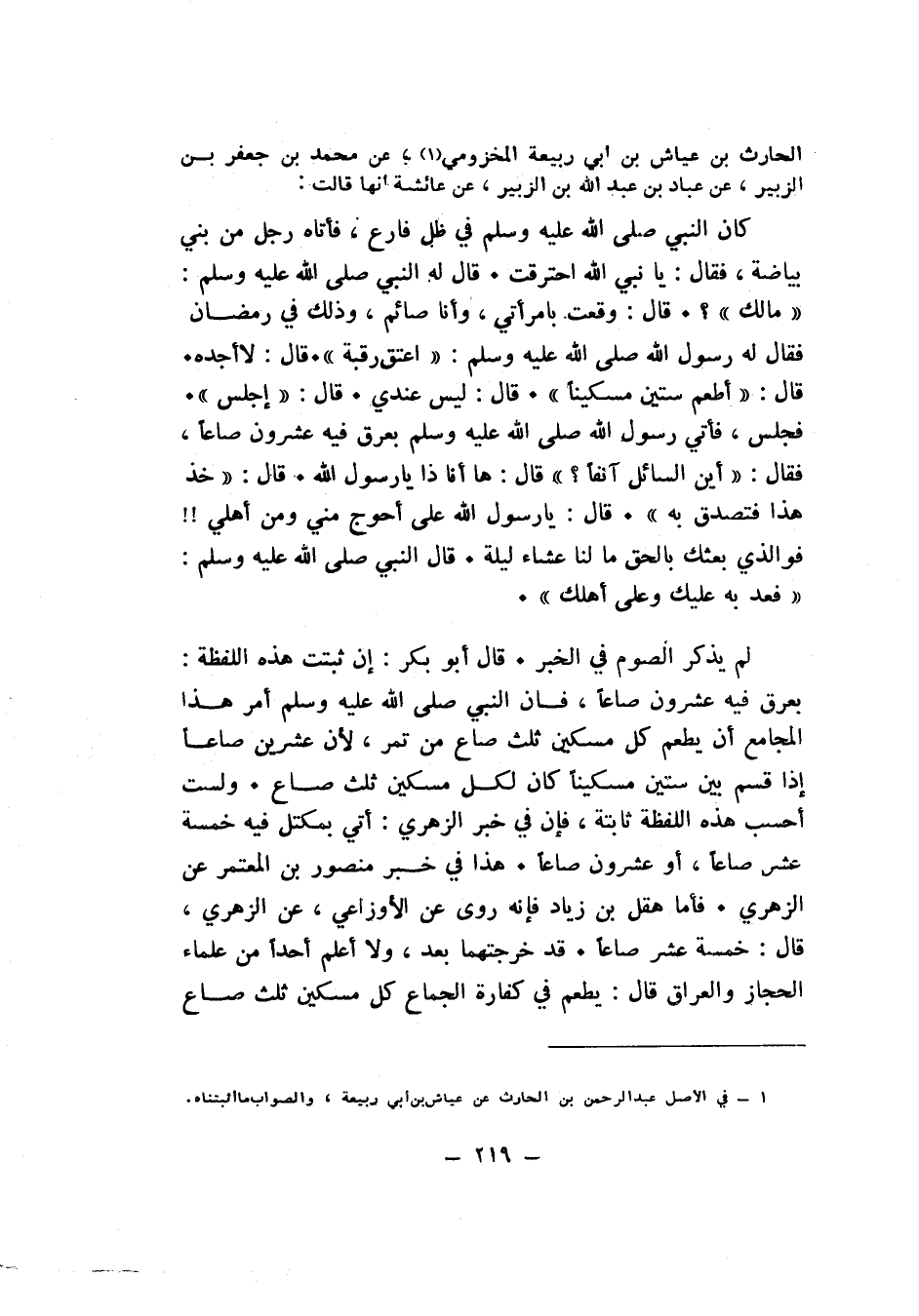 كَانَ النَّبِيُّ صَلَّى اللَّهُ عَلَيْهِ وَسَلَّمَ فِي ظِلٍّ فَارِعٍ , فَأَتَاهُ رَجُلٌ مِنْ بَنِي بَيَاضَةَ , فَقَالَ : يَا نَبِيَّ اللهِ ، احْتَرَقْتُ ، قَالَ : لَهُ النَّبِيُّ صَلَّى اللَّهُ عَلَيْهِ وَسَلَّمَ : مَا لَكَ ؟ قَالَ : وَقَعْتُ بِامْرَأَتِي وَأَنَا صَائِمٌ وَذَلِكَ فِي رَمَضَانَ , فَقَالَ لَهُ رَسُولُ اللهِ صَلَّى اللَّهُ عَلَيْهِ وَسَلَّمَ : أَعْتِقْ رَقَبَةً ، قَالَ : لاَ أَجِدُهُ , ، قَالَ : أَطْعِمْ سِتِّينَ مِسْكِينًا , ، قَالَ : لَيْسَ عِنْدِي , ، قَالَ : اجْلِسْ , فَجَلَسَ , فَأُتِيَ رَسُولُ اللهِ صَلَّى اللَّهُ عَلَيْهِ وَسَلَّمَ بِعَرَقٍ فِيهِ عِشْرُونَ صَاعًا , فَقَالَ : أَيْنَ السَّائِلُ آنِفًا ؟ قَالَ : هَا أَنَا ذَا يَا رَسُولَ اللهِ , ، قَالَ : خُذْ هَذَا فَتَصَدَّقْ بِهِ , ، قَالَ : يَا رَسُولَ اللهِ , عَلَى أَحْوَجَ مِنِّي وَمِنْ أَهْلِي ؟ فَوَالَّذِي بَعَثَكَ بِالْحَقِّ مَا لَنَا عَشَاءُ لَيْلَةٍ , ، قَالَ : النَّبِيُّ صَلَّى اللَّهُ عَلَيْهِ وَسَلَّمَ : فَعُدْ بِهِ عَلَيْكَ وَعَلَى أَهْلِكَ.