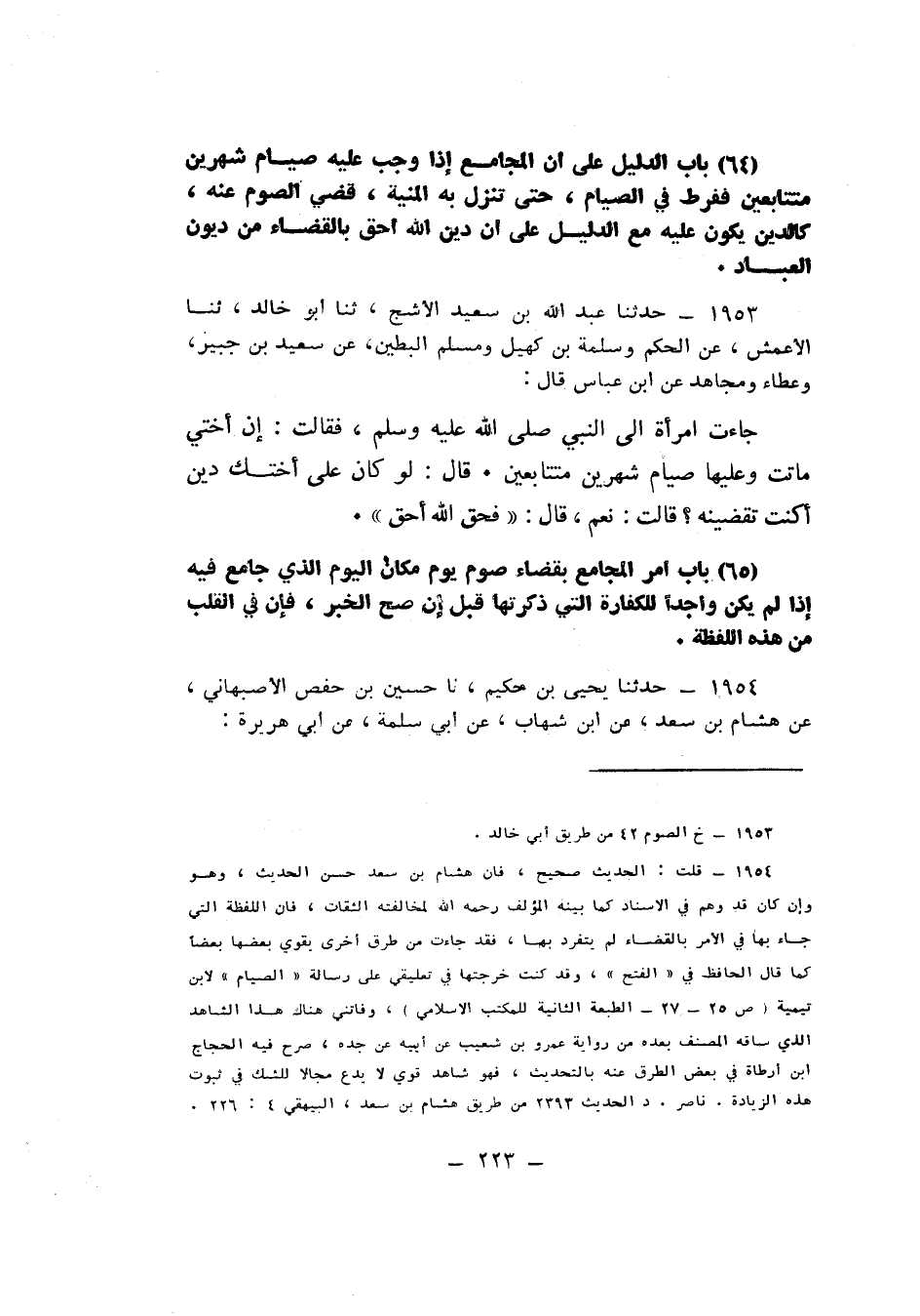1955 - الْخَبَرُ عَنِ ابْنِ شِهَابٍ، عَنْ حُمَيْدِ بْنِ عَبْدِ الرَّحْمَنِ هُوَ الصَّحِيحُ لَا عَنْ أَبِي سَلَمَةَ، وَقَدْ رَوَى أَيْضًا الْحَجَّاجُ بْنُ أَرْطَاةَ، عَنْ عَمْرِو بْنِ شُعَيْبٍ، عَنْ أَبِيهِ , عَنْ جَدِّهِ مِثْلَ خَبَرِ الزُّهْرِيِّ. وَقَالَ فِي خَبَرِ عَمْرِو بْنِ شُعَيْبٍ: حَدَّثَنَا مُحَمَّدُ بْنُ الْعَلَاءِ بْنِ كُرَيْبٍ , وَهَارُونُ بْنُ إِسْحَاقَ قَالَا: ثنا أَبُو خَالِدٍ , قَالَ هَارُونُ: قَالَ حَجَّاجٌ: وَأَخْبَرَنِي عَمْرُو بْنُ شُعَيْبٍ , وَقَالَ مُحَمَّدُ بْنُ الْعَلَاءِ: عَنِ الْحَجَّاجِ , عَنْ عَمْرِو بْنِ شُعَيْبٍ: حَدَّثَنَا الْحُسَيْنُ بْنُ مَهْدِيٍّ , نا عَبْدُ الرَّزَّاقِ , أَخْبَرَنَا ابْنُ الْمُبَارَكِ قَالَ: الْحَجَّاجُ بْنُ أَرْطَاةَ لَمْ يَسْمَعْ مِنَ الزُّهْرِيِّ شَيْئًاK1954 - قال الألباني: الحديث صحيح فإن هشام بن سعد حسن الحديث وهو وإن كان وهم في الإسناد كما بينه المؤلف لمخالفته الثقات فإن اللفظة التي جاء بها في الأمر بالقضاء لم يتفرد بها فقد جاءت من طرق أخرى يقوي بعضها بعضا كما قال الحافظ في الفتح وقد كنت خرجتها في تعليقي على رسالة الصيام لابن تيمية وفاتني هناك هذا الشاهد الذي ساقه المصنف بعده من رواية عمرو بن شعيب عن أبيه عن جده صرح فيه الحجاج بن أرطاة في بعض الطرق بالتحديث فهو شاهد قوي لا يدع مجالا للشك قي ثبوت هذه الزيادة