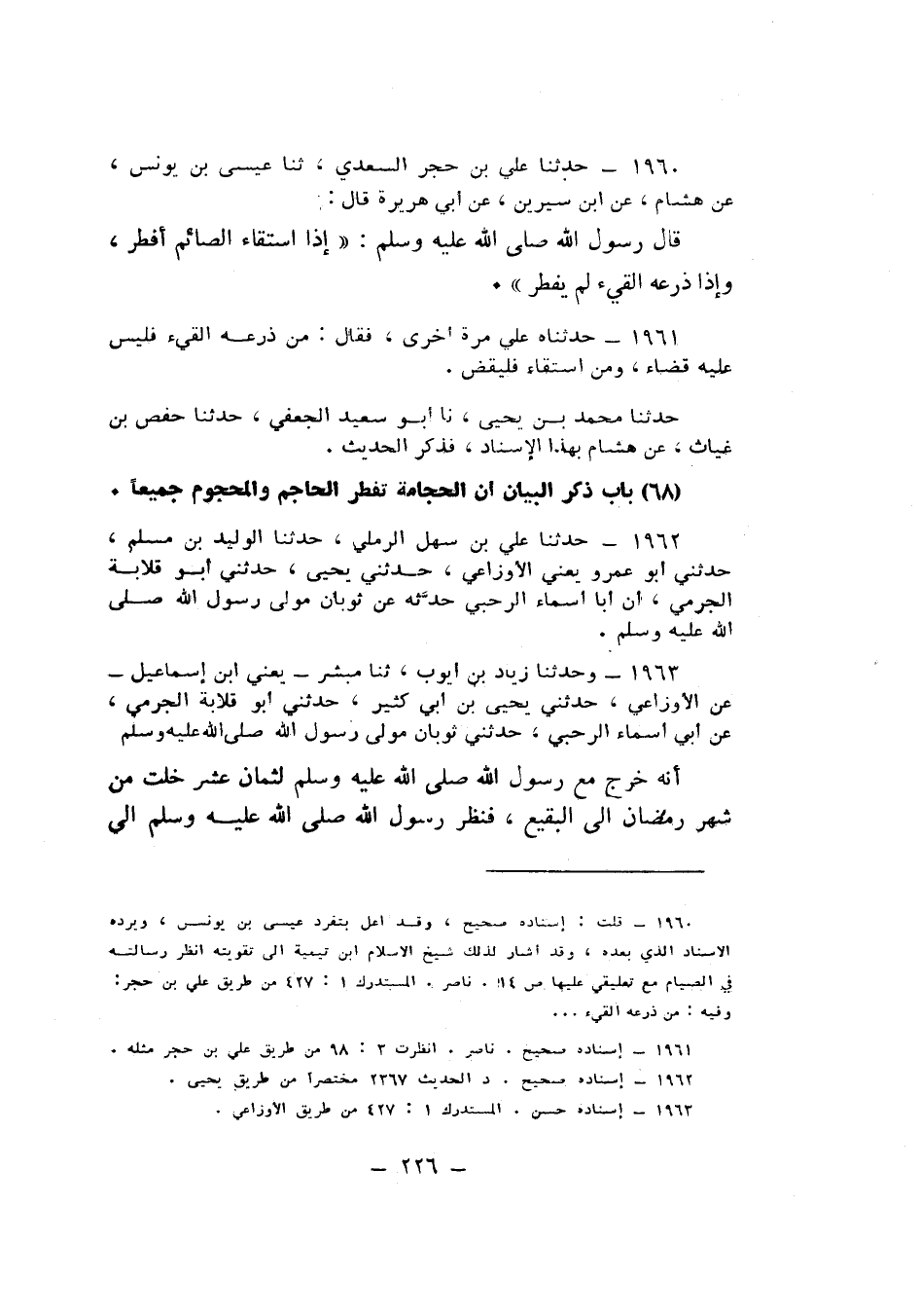 1961 - حَدَّثَنَاهُ عَلِيُّ مَرَّةً أُخْرَى فَقَالَ: «مَنْ ذَرَعَهُ الْقَيْيءُ فَلَيْسَ عَلَيْهِ قَضَاءٌ، وَمَنِ اسْتَقَاءَ فَلْيَقْضِ» حَدَّثَنَا مُحَمَّدُ بْنُ يَحْيَى، نا أَبُو سَعِيدٍ الْجُعْفِيُّ، حَدَّثَنَا حَفْصُ بْنُ غِيَاثٍ، عَنْ هِشَامٍ بِهَذَا الْإِسْنَادِ، فَذَكَرَ الْحَدِيثَK1961 - قال الألباني: إسناده صحيح