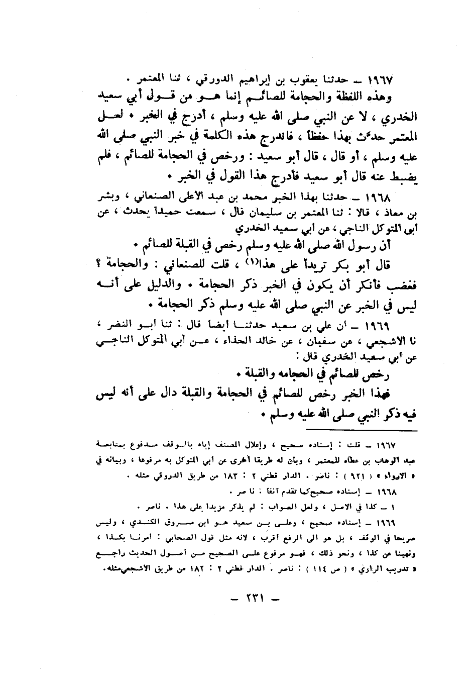 1968 - حَدَّثَنَا بِهَذَا الْخَبَرِ مُحَمَّدُ بْنُ عَبْدِ الْأَعْلَى الصَّنْعَانِيُّ، وَبِشْرُ بْنُ مُعَاذٍ قَالَا: ثنا الْمُعْتَمِرُ بْنُ سُلَيْمَانَ قَالَ: سَمِعْتُ حُمَيْدًا يُحَدِّثُ، عَنْ أَبِي الْمُتَوَكِّلِ النَّاجِي، عَنْ أَبِي سَعِيدٍ الْخُدْرِيِّ: «أَنَّ رَسُولَ اللَّهِ صَلَّى اللهُ عَلَيْهِ وَسَلَّمَ §رَخَّصَ فِي الْقُبْلَةِ لِلصَّائِمِ» قَالَ أَبُو بَكْرٍ: «لَمْ يَذْكُرْ مَزِيدًا عَلَى هَذَا» قُلْتُ لِلصَّنَعَانِيِّ: وَالْحِجَامَةُ؟ فَغَضِبَ، فَأَنْكَرَ أَنْ يَكُونَ فِي الْخَبَرِ ذِكْرُ الْحِجَامَةِ، وَالدَّلِيلُ عَلَى أَنَّهُ لَيْسَ فِي الْخَبَرِ عَنِ النَّبِيِّ صَلَّى اللهُ عَلَيْهِ وَسَلَّمَ ذِكْرُ الْحِجَامَةِK1968 - قال الألباني: إسناده صحيح كما تقدم