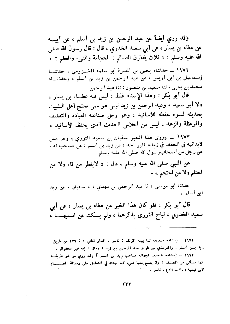 1973 - وَرَوَى هَذَا الْخَبَرَ سُفْيَانُ بْنُ سَعِيدٍ الثَّوْرِيُّ، وَهُوَ مِمَّنْ لَا يُدَانِيهِ فِي الْحِفْظِ فِي زَمَانِهِ كَثِيرُ أَحَدٍ , عَنْ زَيْدِ بْنِ أَسْلَمَ، عَنْ صَاحِبٍ لَهُ عَنْ رَجُلٍ مِنْ أَصْحَابِ رَسُولِ اللَّهِ صَلَّى اللهُ عَلَيْهِ وَسَلَّمَ عَنِ النَّبِيِّ صَلَّى اللهُ عَلَيْهِ وَسَلَّمَ قَالَ: «§لَا يُفْطِرُ مَنْ قَاءَ، وَلَا مَنِ احْتَلَمَ، وَلَا مَنِ احْتَجَمَ» حَدَّثَنَا أَبُو مُوسَى، نا عَبْدُ الرَّحْمَنِ بْنُ مَهْدِيٍّ، نا سُفْيَانُ، عَنْ زَيْدِ بْنِ أَسْلَمَ قَالَ أَبُو بَكْرٍ: " فَلَوْ كَانَ هَذَا الْخَبَرُ عَنْ عَطَاءِ بْنِ يَسَارٍ، عَنْ أَبِي سَعِيدٍ الْخُدْرِيِّ لَبَاحَ الثَّوْرِيُّ، بِذِكْرِهِمَا وَلَمْ يَسْكُتْ عَنِ اسْمَيْهِمَا يَقُولُ: عَنْ صَاحِبٍ لَهُ عَنْ رَجُلٍ وَإِنَّمَا يُقَالُ فِي الْإَخْبَارِ: عَنْ صَاحِبٍ لَهُ وَعَنْ رَجُلٍ إِذَا كَانَ غَيْرَ مَشْهُورٍ "