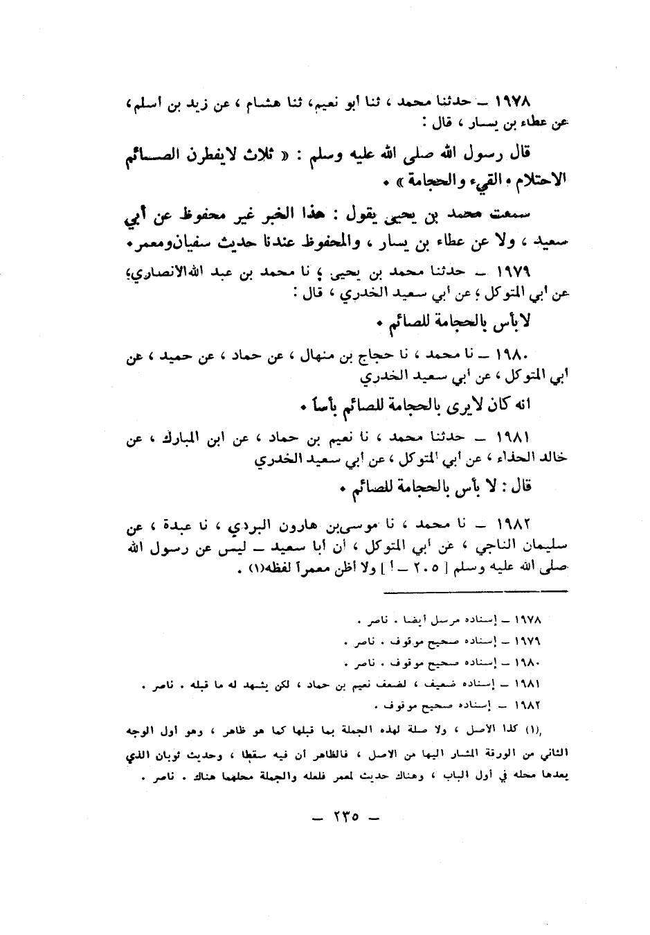 1978 - حَدَّثَنَا مُحَمَّدٌ، ثنا أَبُو نُعَيْمٍ، ثنا هِشَامٌ، عَنْ زَيْدِ بْنِ أَسْلَمَ، عَنْ عَطَاءِ بْنِ يَسَارٍ قَالَ: قَالَ رَسُولُ اللَّهِ صَلَّى اللهُ عَلَيْهِ وَسَلَّمَ: " §ثَلَاثٌ لَا يُفَطِّرْنَ الصَّائِمَ: الِاحْتِلَامُ، وَالْقَيْءُ، وَالْحِجَامَةُ " سَمِعْتُ مُحَمَّدَ بْنَ يَحْيَى يَقُولُ: " هَذَا الْخَبَرُ غَيْرُ مَحْفُوظٍ عَنْ أَبِي سَعِيدٍ، وَلَا عَنْ عَطَاءِ بْنِ يَسَارٍ، وَالْمَحْفُوظُ عِنْدَنَا: حَدِيثُ سُفْيَانَ، وَمَعْمَرٍ "K1978 - قال الألباني: إسناده مرسل أيضا
