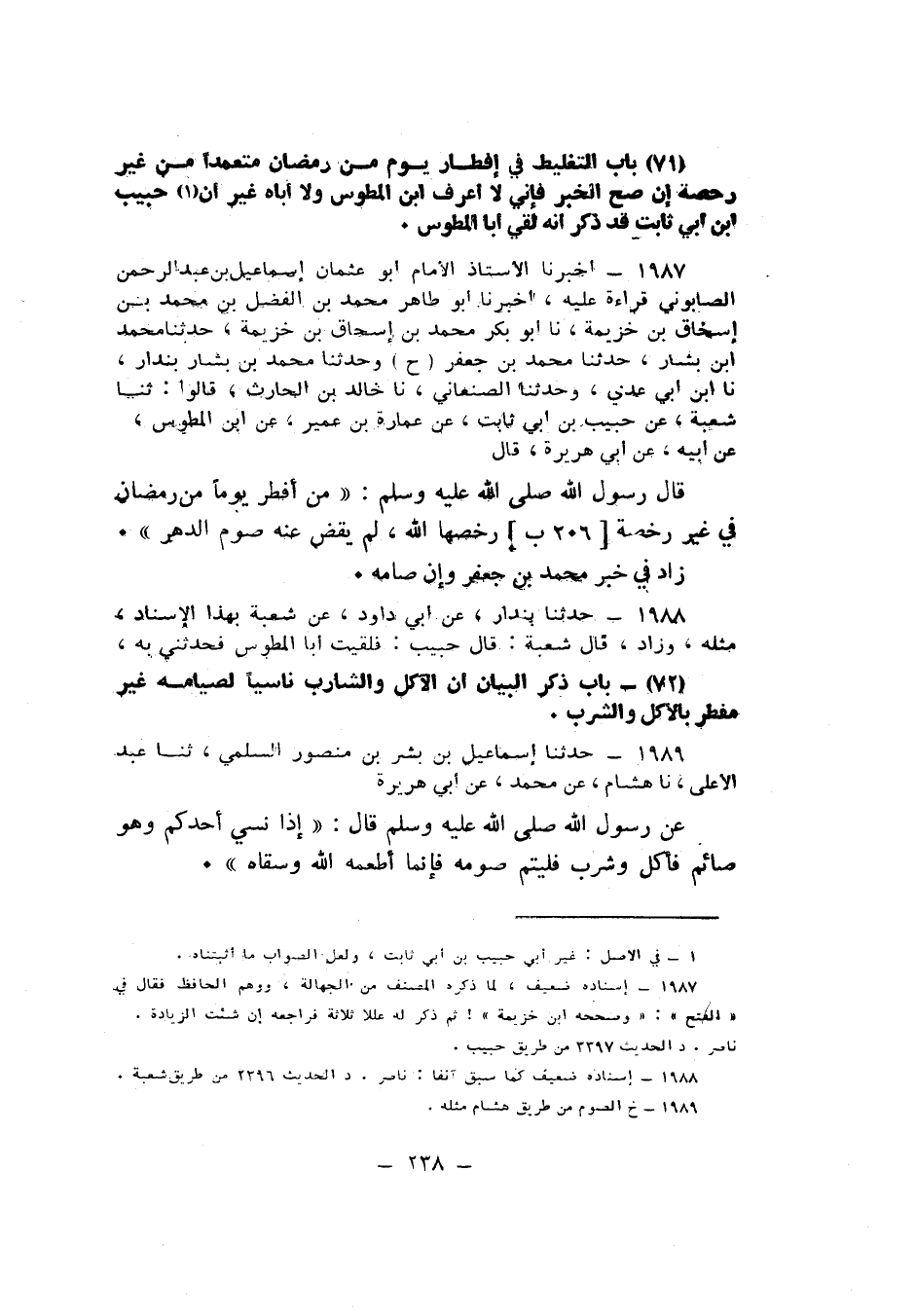 1987 - مُحَمَّدُ بْنُ بَشَّارٍ، حَدَّثَنَا مُحَمَّدُ بْنُ جَعْفَرٍ، ح وَحَدَّثَنَا مُحَمَّدُ بْنُ بَشَّارٍ بُنْدَارٌ، نا ابْنُ أَبِي عَدِيٍّ، وَحَدَّثَنَا الصَّنْعَانِيُّ، نا خَالِدُ بْنُ الْحَارِثِ قَالُوا: ثنا شُعْبَةُ، عَنْ حَبِيبِ بْنِ أَبِي ثَابِتٍ، عَنْ عُمَارَةَ بْنِ عُمَيْرٍ، عَنِ ابْنِ الْمُطَوِّسِ، عَنْ أَبِيهِ، عَنْ أَبِي هُرَيْرَةَ قَالَ: قَالَ رَسُولُ اللَّهِ صَلَّى اللهُ عَلَيْهِ وَسَلَّمَ: «§مَنْ أَفْطَرَ يَوْمًا مِنْ رَمَضَانَ فِي غَيْرِ رُخْصَةٍ رَخَّصَهَا اللَّهُ لَمْ يَقْضِ عَنْهُ صَوْمُ الدَّهْرِ» زَادَ فِي خَبَرِ مُحَمَّدِ بْنِ جَعْفَرٍ: «وَإِنْ صَامَهُ» K1987 - قال: إسناده ضعيف لما ذكر المصنف من الجهالة ووهم الحافظ فقال: صححه ابن خزيمة! ثم ذكر له عللا ثلاثة
