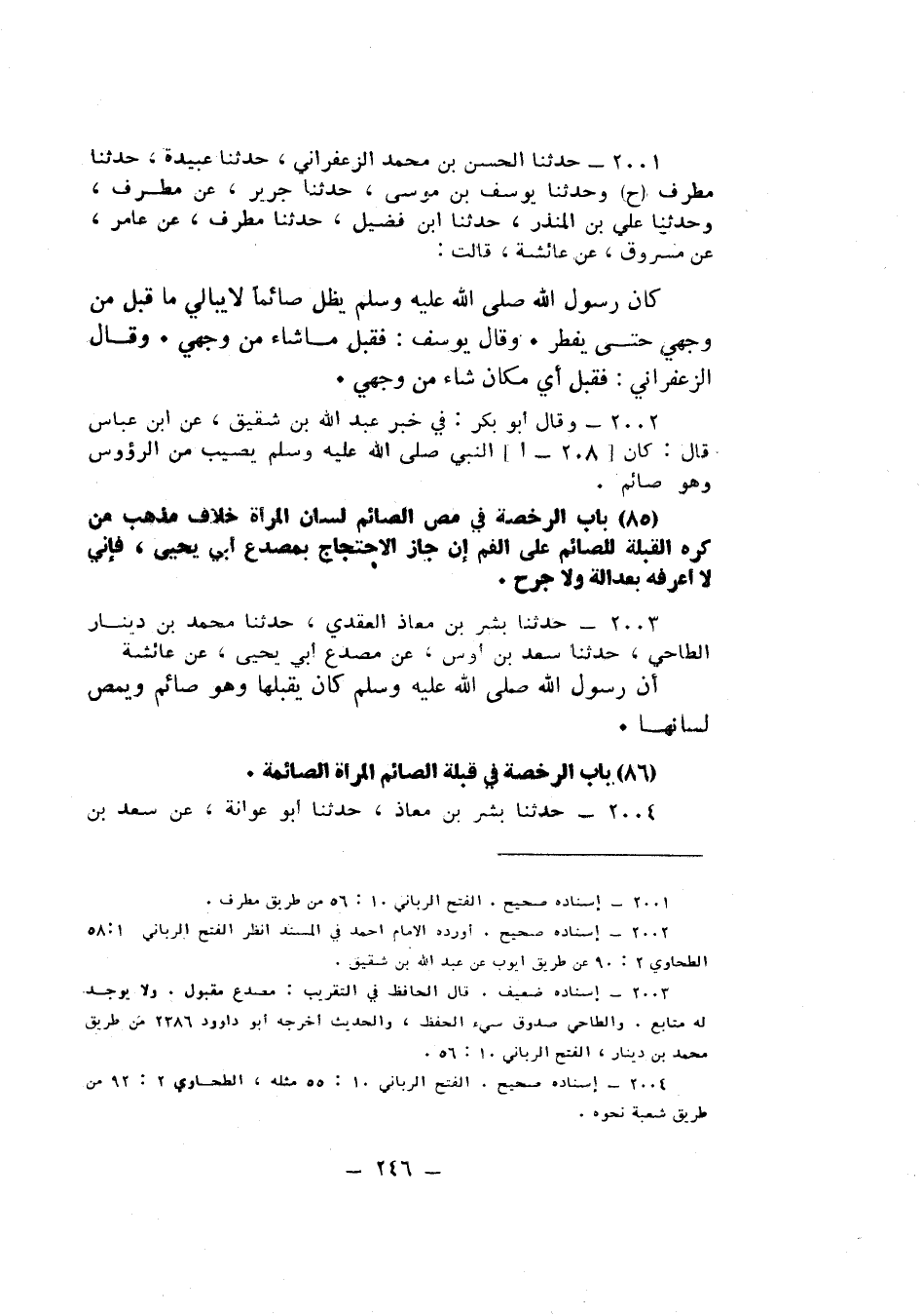 2004 - حَدَّثَنَا بِشْرُ بْنُ مُعَاذٍ، حَدَّثَنَا أَبُو عَوَانَةَ، عَنْ سَعْدِ بْنِ إِبْرَاهِيمَ، ح وَحَدَّثَنَا يَحْيَى بْنُ حَكِيمٍ، حَدَّثَنَا ابْنُ أَبِي عَدِيٍّ، عَنْ شُعْبَةَ، عَنْ سَعْدِ بْنِ إِبْرَاهِيمَ، عَنْ طَلْحَةَ بْنِ عَبْدِ اللَّهِ، عَنْ عَائِشَةَ قَالَتْ: أَهْوَى إِلَيَّ رَسُولُ اللَّهِ صَلَّى اللهُ عَلَيْهِ وَسَلَّمَ لِيُقَبِّلَنِي، فَقُلْتُ: إِنِّي صَائِمَةٌ قَالَ: «§وَأَنَا صَائِمٌ» فَقَبَّلَنِي قَالَ بِشْرُ بْنُ مُعَاذٍ: عَنْ طَلْحَةَ رَجُلٍ مِنْ قَوْمِهِK2004 - قال الأعظمي: إسناده صحيح