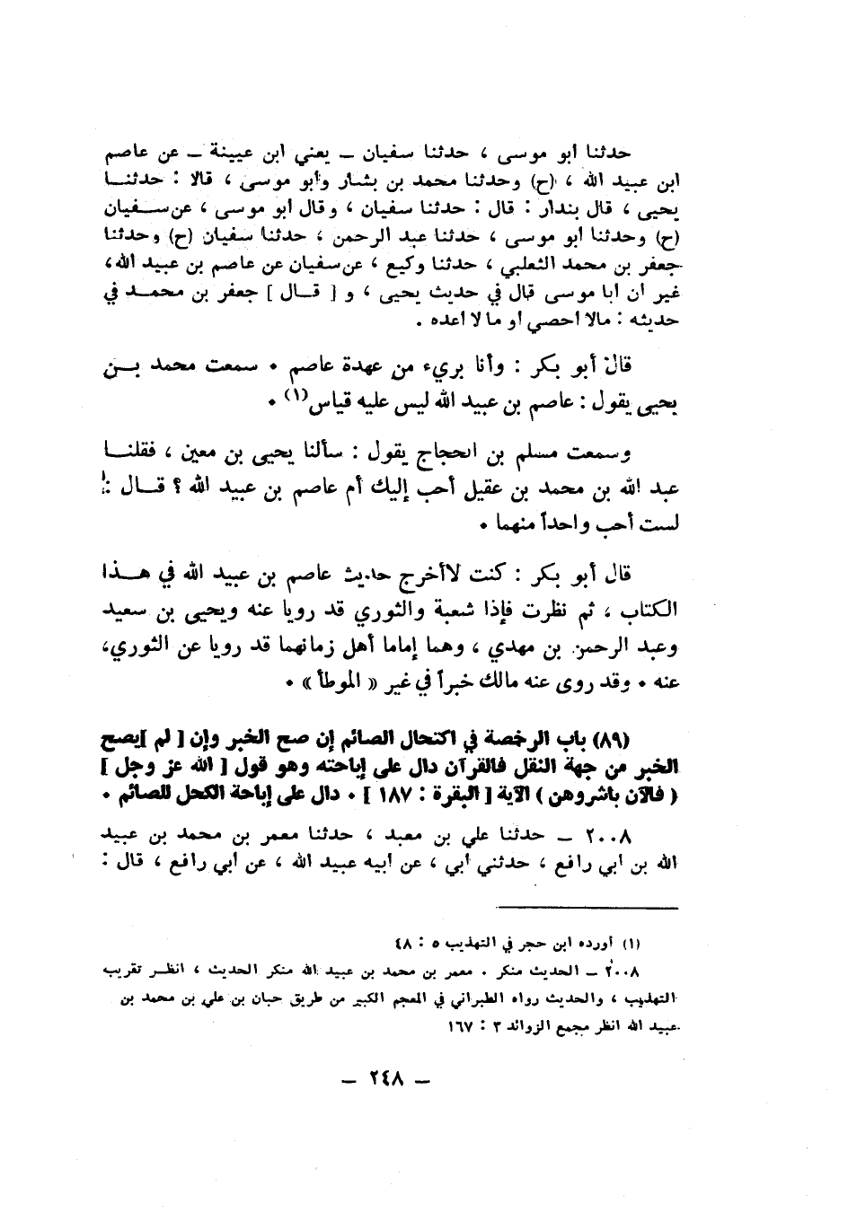 2008 - حَدَّثَنَا عَلِيُّ بْنُ مَعْبَدٍ، حَدَّثَنَا مَعْمَرُ بْنُ مُحَمَّدِ بْنِ عُبَيْدِ اللَّهِ بْنِ أَبِي رَافِعٍ، حَدَّثَنِي أَبِي، عَنْ أَبِيهِ عُبَيْدِ اللَّهِ , عَنْ أَبِي رَافِعٍ قَالَ: «نَزَلَ رَسُولُ اللَّهِ صَلَّى اللهُ عَلَيْهِ وَسَلَّمَ خَيْبَرَ وَنَزَلْتُ مَعَهُ , فَدَعَانِي بِكُحْلِ إِثْمِدٍ , §فَاكْتَحَلَ فِي رَمَضَانَ وَهُوَ صَائِمٌ إِثْمِدَ غَيْرَ مُمَسَّكٍ» قَالَ أَبُو بَكْرٍ: «أَنَا أَبْرَأُ مِنْ عُهْدَةِ هَذَا الْإِسْنَادِ لِمَعْمَرٍ» K2008 - قال الأعظمي: الحديث منكر معمر بن محمد بن عبيد الله منكر الحديث