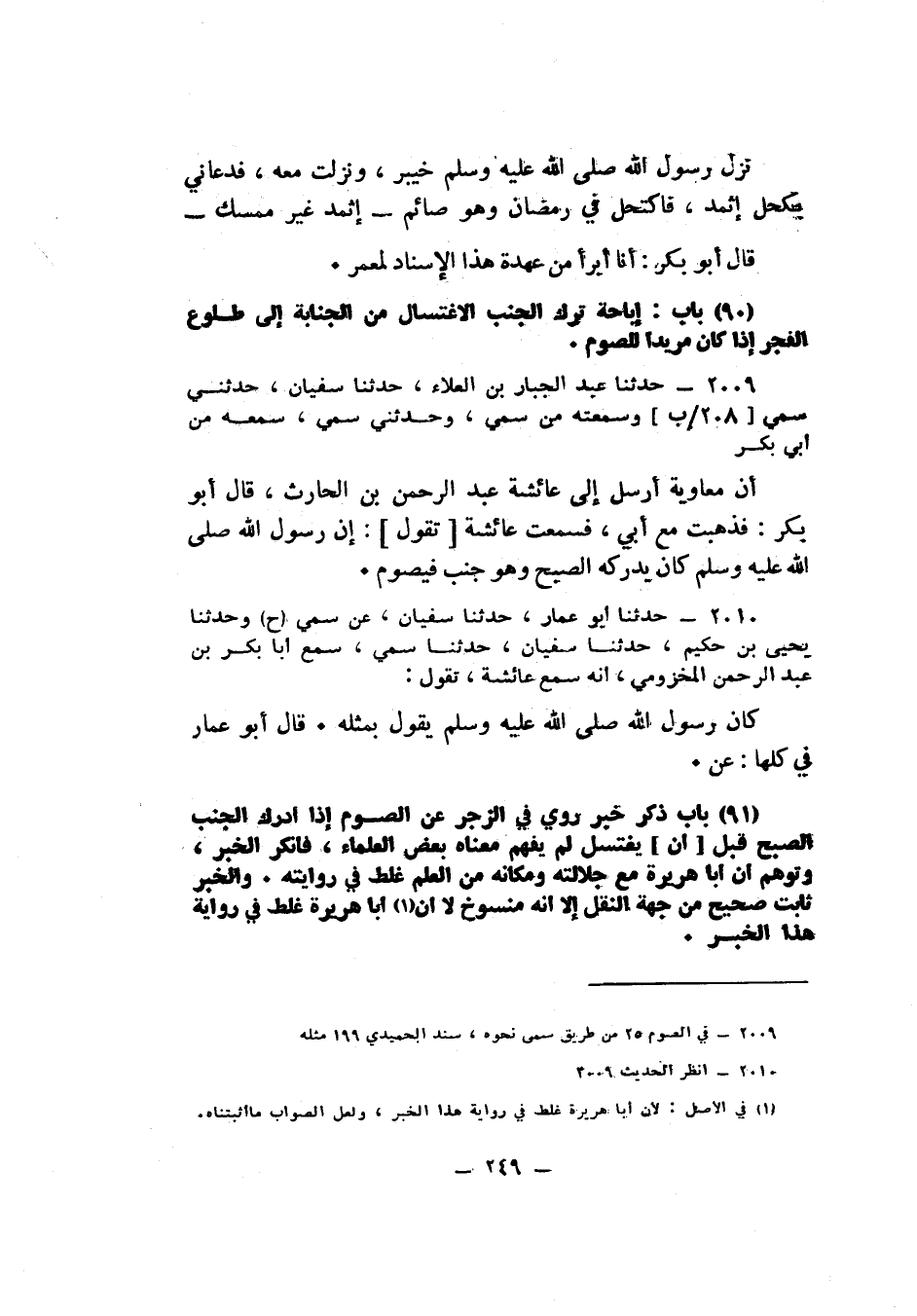 2009 - حَدَّثَنَا عَبْدُ الْجَبَّارِ بْنُ الْعَلَاءِ، حَدَّثَنَا سُفْيَانُ، حَدَّثَنِي سُمَيٌّ، وَسَمِعْتُهُ مِنْ سُمَيٍّ , وَحَدَّثَنِي، سُمَيٌّ سَمِعَهُ مِنْ أَبِي بَكْرٍ أَنَّ مُعَاوِيَةَ أَرْسَلَ إِلَى عَائِشَةَ عَبْدَ الرَّحْمَنِ بْنَ الْحَارِثِ. قَالَ أَبُو بَكْرٍ: فَذَهَبْتُ مَعَ أَبِي , فَسَمِعْتُ عَائِشَةَ تَقُولُ: «إِنَّ رَسُولَ اللَّهِ صَلَّى اللهُ عَلَيْهِ وَسَلَّمَ كَانَ §يُدْرِكُهُ الصُّبْحُ وَهُوَ جُنُبٌ فَيَصُومُ» .