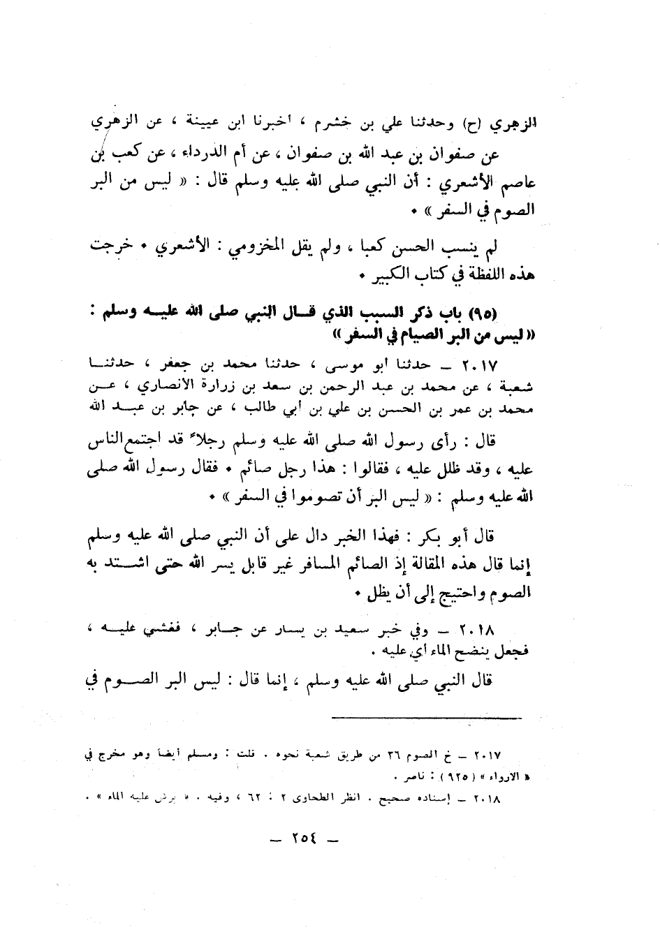 2018 - وَفِي خَبَرِ سَعِيدِ بْنِ يَسَارٍ , عَنْ جَابِرٍ: فَغُشِيَ عَلَيْهِ , فَجَعَلَ يَنْضَحُ الْمَاءَ، أَيْ: عَلَيْهِ. قَالَ النَّبِيُّ صَلَّى اللهُ عَلَيْهِ وَسَلَّمَ، إِنَّمَا قَالَ: لَيْسَ الْبِرُّ الصَّوْمَ فِي السَّفَرِ: أَيْ: لَيْسَ الْبِرُّ الصَّوْمَ فِي السَّفَرِ حَتَّى يُغْشَى عَلَى الصَّائِمِ , وَيُحْتَاجُ إِلَى أَنْ يُظَلَّلَ وَيُنْضَحَ عَلَيْهِ , إِذِ اللَّهُ عَزَّ وَجَلَّ رَخَّصَ لِلْمُسَافِرِ فِي الْفِطْرِ , وَجَعَلَ لَهُ أَنْ يَصُومَ فِي أَيَّامٍ أُخَرَ , وَأَعْلَمَ فِي مُحْكَمِ تَنْزِيلِهِ أَنَّهُ أَرَادَ بِهِمُ الْيُسْرَ لَا الْعُسْرَ فِي ذَلِكَ , فَمَنْ لَمْ يَقْبَلْ يُسْرَ اللَّهِ جَازَ أَنْ يُقَالَ لَهُ: لَيْسَ أَخْذُكَ بِالْعُسْرِ فَيَشْتَدُّ الْعُسْرُ عَلَيْكَ مِنَ الْبِرِّ. وَقَدْ يَجُوزُ أَنْ يَكُونَ فِي هَذَا الْخَبَرِ: لَيْسَ الْبِرَّ أَنْ تَصُومُوا فِي السَّفَرِ: أَيْ: لَيْسَ كُلُّ الْبِرِّ هَذَا , قَدْ يَكُونُ الْبِرُّ أَيْضًا أَنْ تَصُومُوا فِي السَّفَرِ , وَقَبُولُ رُخْصَةِ اللَّهِ وَالْإِفْطَارِ فِي السَّفَرِ. وَسَأُدَلِّلُ بَعْدُ إِنْ شَاءَ اللَّهُ عَزَّ وَجَلَّ عَلَى صِحَّةِ هَذَا التَّأْوِيلِ حَدَّثَنَا بِخَبَرِ سَعِيدِ بْنِ يَسَارٍ بُنْدَارٌ , قَالَ: حَدَّثَنَا حَمَّادُ بْنُ مَسْعَدَةَ , عَنِ ابْنِ أَبِي ذِئْبٍK2018 قال الأعظمي: إسناده صحيح