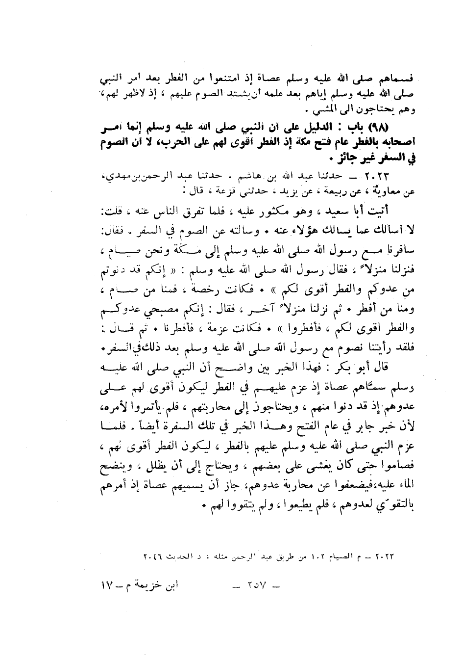 2023 - حَدَّثَنَا عَبْدُ اللَّهِ بْنُ هَاشِمٍ، حَدَّثَنَا عَبْدُ الرَّحْمَنِ بْنُ مَهْدِيٍّ، عَنْ مُعَاوِيَةَ، عَنْ رَبِيعَةَ، عَنْ يَزِيدَ، حَدَّثَنِي قَزْعَةُ قَالَ: أَتَيْتُ أَبَا سَعِيدٍ وَهُوَ مَكْثُورٌ عَلَيْهِ , فَلَمَّا تَفَرَّقَ النَّاسُ عَنْهُ قُلْتُ: لَا أَسْأَلُكُ عَمَّا يَسْأَلُكَ هَؤُلَاءِ عَنْهُ , وَسَأَلْتُهُ عَنِ الصَّوْمِ فِي السَّفَرِ , فَقَالَ: سَافَرْنَا مَعَ رَسُولِ اللَّهِ صَلَّى اللهُ عَلَيْهِ وَسَلَّمَ إِلَى مَكَّةَ وَنَحْنُ صِيَامٌ , فَنَزَلْنَا مَنْزِلًا , فَقَالَ رَسُولُ اللَّهِ صَلَّى اللهُ عَلَيْهِ وَسَلَّمَ: «§إِنَّكُمْ قَدْ دَنَوْتُمْ مِنْ عَدُوِّكُمْ , وَالْفِطْرُ أَقْوَى لَكُمْ» , فَكَانَتْ رُخْصَةً , فَمِنَّا مَنْ صَامَ , وَمِنَّا مَنْ أَفْطَرَ , ثُمَّ نَزَلْنَا مَنْزِلًا آخَرَ , فَقَالَ: «إِنَّكُمْ مُصَبِّحُو عَدُوِّكُمْ , وَالْفِطْرُ أَقْوَى لَكُمْ , فَأَفْطِرُوا» , فَكَانَتْ عَزْمَةً فَأَفْطَرْنَا , ثُمَّ قَالَ: فَلَقَدْ رَأَيْتُنَا نَصُومُ مَعَ رَسُولِ اللَّهِ صَلَّى اللهُ عَلَيْهِ وَسَلَّمَ بَعْدَ ذَلِكَ فِي السَّفَرِ قَالَ أَبُو بَكْرٍ: " فَهَذَا الْخَبَرُ بَيَّنَ وَأَوْضَحَ أَنَّ النَّبِيَّ صَلَّى اللهُ عَلَيْهِ وَسَلَّمَ سَمَّاهُمْ عُصَاةً إِذْ عَزَمَ عَلَيْهِمْ فِي الْفِطْرِ لِيَكُونَ أَقْوَى لَهُمْ عَلَى عَدُوِّهِمْ , إِذْ قَدْ دَنَوْا مِنْهُمْ , وَيَحْتَاجُونَ إِلَى مُحَارَبَتِهِمْ , فَلَمْ يَأْتَمِرُوا لِأَمْرِهِ؛ لِأَنَّ خَبَرَ جَابِرٍ فِي عَامِ الْفَتْحِ , وَهَذَا الْخَبَرُ فِي تِلْكَ السَّفْرَةِ , أَيْضًا فَلَمَّا عَزَمَ النَّبِيُّ صَلَّى اللهُ عَلَيْهِ وَسَلَّمَ عَلَيْهِمْ بِالْفِطْرِ ليَكُونَ الْفِطْرُ أَقْوَى لَهُمْ , فَصَامُوا حَتَّى كَانَ يُغْشَى عَلَى بَعْضِهِمْ , وَيَحْتَاجُ إِلَى أَنْ يُظَلَّلَ , وَيُنْضَحَ الْمَاءُ عَلَيْهِ , فَيَضْعُفُوا عَنْ مُحَارَبَةِ عَدُوِّهِمْ , جَازَ أَنْ يُسَمِّيَهُمْ عُصَاةً , إِذْ أَمْرَهُمْ بِالتَّقَوِّي لِعَدُوِّهِمْ , فَلَمْ يُطِيعُوا , وَلَمْ يَتَقَوَّوْا لَهُمْ