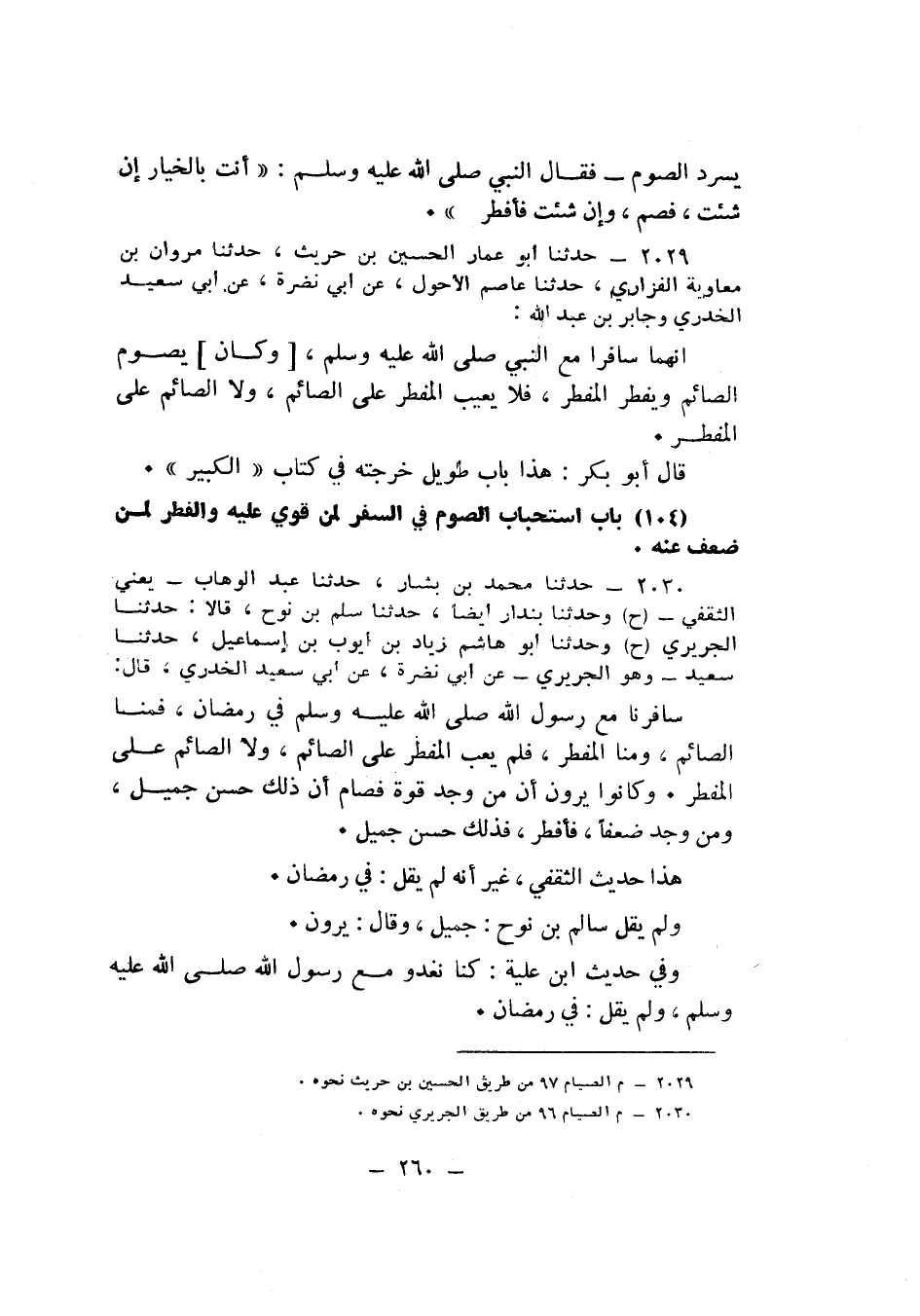 2030 - حَدَّثَنَا مُحَمَّدُ بْنُ بَشَّارٍ، حَدَّثَنَا عَبْدُ الْوَهَّابِ يَعْنِي الثَّقَفِيَّ، ح وَحَدَّثَنَا بُنْدَارٌ أَيْضًا , حَدَّثَنَا سَالِمُ بْنُ نُوحٍ قَالَا: حَدَّثَنَا الْجُرَيْرِيُّ، ح وَحَدَّثَنَا أَبُو هَاشِمٍ زِيَادُ بْنُ أَيُّوبَ عَنْ إِسْمَاعِيلَ , حَدَّثَنَا سَعِيدٌ وَهُوَ الْجُرَيْرِيُّ , عَنْ أَبِي نَضْرَةَ، عَنْ أَبِي سَعِيدٍ الْخُدْرِيِّ قَالَ: «§سَافَرْنَا مَعَ رَسُولِ اللَّهِ صَلَّى اللهُ عَلَيْهِ وَسَلَّمَ فِي رَمَضَانَ , فَمِنَّا الصَّائِمُ وَمِنَّا الْمُفْطِرُ , فَلَمْ يَعِبِ الْمُفْطِرُ عَلَى الصَّائِمِ , وَلَا الصَّائِمُ عَلَى الْمُفْطِرِ» وَكَانُوا يَرَوْنَ أَنَّ مَنْ وَجَدَ قُوَّةً فَصَامَ أَنَّ ذَلِكَ حَسَنٌ جَمِيلٌ , وَمَنْ وَجَدَ ضَعْفًا فَأَفْطَرَ فَذَلِكَ حَسَنٌ جَمِيلٌ " هَذَا حَدِيثُ الثَّقَفِيِّ غَيْرَ أَنَّهُ لَمْ يَقُلْ فِي رَمَضَانَ , وَلَمْ يَقُلْ سَالِمُ بْنُ نُوحٍ: جَمِيلٌ " وَقَالَ: يَرَوْنَ , وَفِي حَدِيثِ ابْنِ عُلَيَّةَ: كُنَّا نَغْدُو مَعَ رَسُولِ اللَّهِ صَلَّى اللهُ عَلَيْهِ وَسَلَّمَ , وَلَمْ يَقُلْ: فِي رَمَضَانَ
