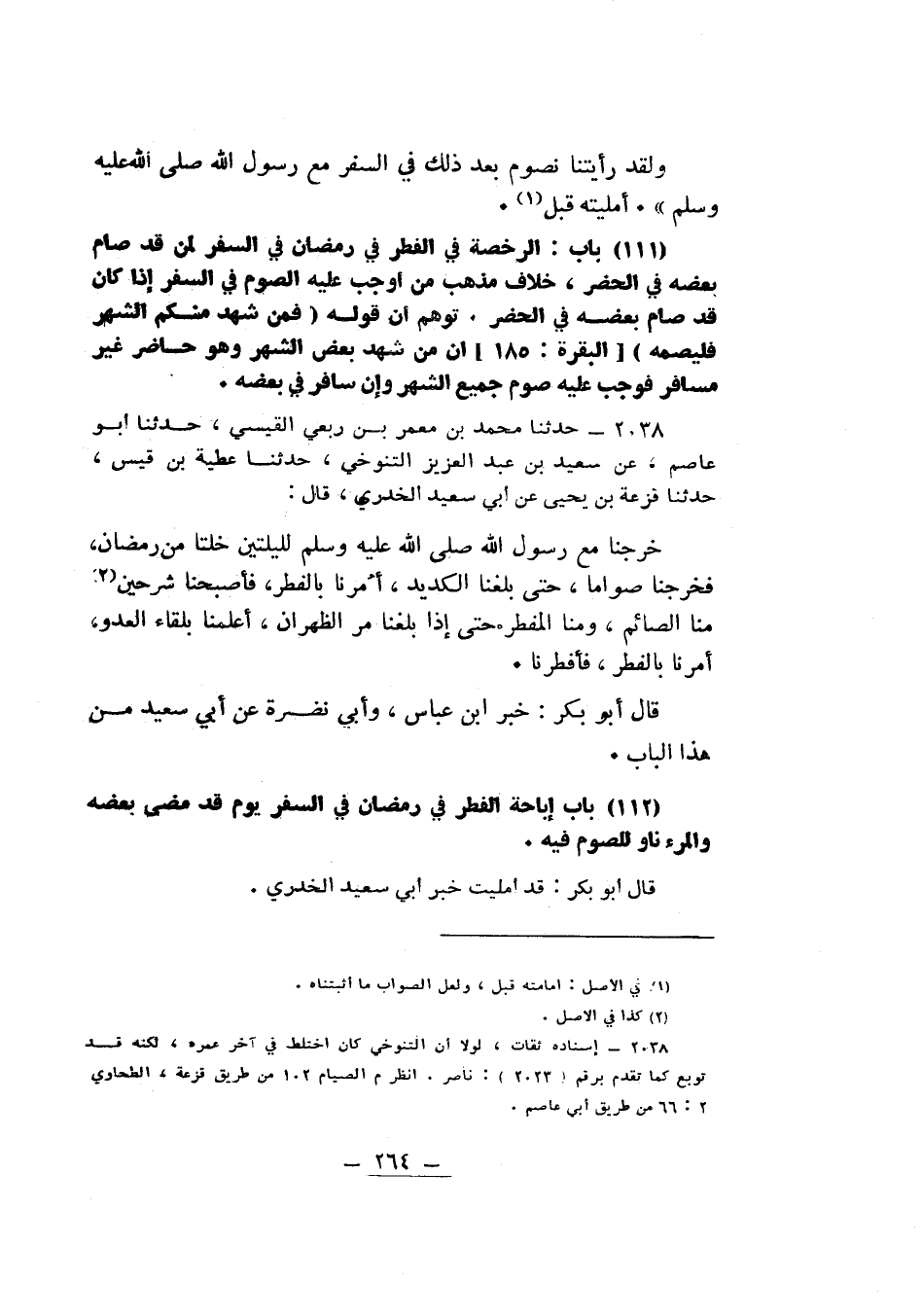 2038 - حَدَّثَنَا مُحَمَّدُ بْنُ مَعْمَرِ بْنِ رِبْعِيٍّ الْقَيْسِيُّ، حَدَّثَنَا أَبُو عَاصِمٍ، عَنْ سَعِيدِ بْنِ عَبْدِ الْعَزِيزِ التَّنُوخِيِّ، حَدَّثَنَا عَطِيَّةُ بْنُ قَيْسٍ، حَدَّثَنَا قَزْعَةُ بْنُ يَحْيَى، عَنْ أَبِي سَعِيدٍ الْخُدْرِيِّ قَالَ: خَرَجْنَا مَعَ رَسُولِ اللَّهِ صَلَّى اللهُ عَلَيْهِ وَسَلَّمَ لِلَيْلَتَيْنِ خَلَتَا مِنْ رَمَضَانَ , فَخَرَجْنَا صُوَّامًا , حَتَّى بَلَغَنَا الْكَدِيدَ §أُمِرْنَا بِالْفِطْرِ , فَأَصْبَحْنَا شَرِحِينَ , مِنَّا الصَّائِمُ , وَمِنَّا الْمُفْطِرُ , حَتَّى إِذَا بَلَغَنَا مَرَّ الظَّهْرَانِ , أَعْلَمَنَا بِلِقَاءِ الْعَدُوِّ , أُمِرْنَا بِالْفِطْرِ , فَأَفْطَرْنَا " قَالَ أَبُو بَكْرٍ: " خَبَرُ ابْنِ عَبَّاسٍ وَأَبِي نَضْرَةَ , عَنْ أَبِي سَعِيدٍ مِنْ هَذَا الْبَابِK2038 - قال الألباني: إسناده ثقات لولا أن التنوخي كان اختلط في آخر عمره لكن توبع كما تقدم 2023