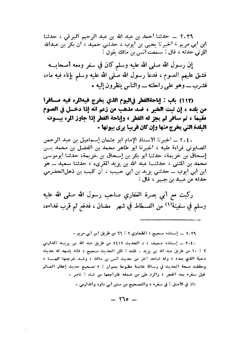 2039 - حَدَّثَنَا أَحْمَدُ بْنُ عَبْدِ اللَّهِ بْنِ عَبْدِ الرَّحِيمِ الْبَرْقِيُّ، حَدَّثَنَا ابْنُ أَبِي مَرْيَمَ، أَخْبَرَنَا يَحْيَى بْنُ أَيُّوبَ، حَدَّثَنِي حُمَيْدٌ، أَنَّ بَكْرَ بْنَ عَبْدِ اللَّهِ الْمُزَنِيَّ حَدَّثَهُ قَالَ: سَمِعْتُ أَنَسَ بْنَ مَالِكٍ يَقُولُ: إِنَّ رَسُولَ اللَّهِ صَلَّى اللهُ عَلَيْهِ وَسَلَّمَ كَانَ فِي سَفَرٍ وَمَعَهُ أَصْحَابُهُ , فَشَقَّ عَلَيْهِمُ الصَّوْمُ , §فَدَعَا رَسُولُ اللَّهِ صَلَّى اللهُ عَلَيْهِ وَسَلَّمَ بِإِنَاءٍ فِيهِ مَاءٌ , فَشَرِبَ وَهُوَ عَلَى رَاحِلَتِهِ , وَالنَّاسُ يَنْظُرُونَ إِلَيْهِK2039 - قال الأعظمي: إسناده صحيح