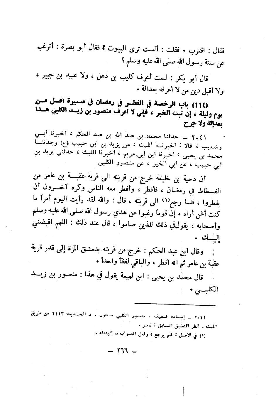 2041 - حَدَّثَنَا مُحَمَّدُ بْنُ عَبْدِ اللَّهِ بْنِ عَبْدِ الْحَكَمِ، أَخْبَرَنَا أَبِي وَشُعَيْبٌ قَالَا: أَخْبَرَنَا اللَّيْثُ، عَنْ يَزِيدَ بْنِ أَبِي حَبِيبٍ، ح وَحَدَّثَنَا مُحَمَّدُ بْنُ يَحْيَى، أَخْبَرَنَا ابْنُ أَبِي مَرْيَمَ، أَخْبَرَنَا اللَّيْثُ، حَدَّثَنِي يَزِيدُ بْنُ أَبِي حَبِيبٍ، عَنْ أَبِي الْخَيْرِ، عَنْ مَنْصُورٍ الْكَلْبِيِّ: أَنَّ دِحْيَةَ بْنَ خَلِيفَةَ خَرَجَ مِنْ قَرْيَتِهِ إِلَى قَرْيَةِ عُقْبَةَ بْنِ عَامِرٍ مِنَ الْفُسْطَاطِ فِي رَمَضَانَ , فَأَفْطَرَ , وَأَفْطَرَ مَعَهُ النَّاسُ , وَكَرِهَ آخَرُونَ أَنْ يُفْطِرُوا , فَلَمَّا رَجَعَ إِلَى قَرْيَتِهِ قَالَ: وَاللَّهِ , §لَقَدْ رَأَيْتُ الْيَوْمَ أَمْرًا , مَا كُنْتُ أَظُنُّ أَرَاهُ , إِنَّ قَوْمًا رَغِبُوا عَنْ هَدْيِ رَسُولِ اللَّهِ صَلَّى اللهُ عَلَيْهِ وَسَلَّمَ وَأَصْحَابِهِ , يَقُولُ فِي ذَلِكَ لِلَّذِينَ صَامُوا , قَالَ عِنْدَ ذَلِكَ: «اللَّهُمَّ اقْبِضْنِي إِلَيْكَ» وَقَالَ ابْنُ عَبْدِ الْحَكَمِ: خَرَجَ مِنْ قَرْيَتِهِ بِدِمَشْقَ الْمِزَّةِ , إِلَى قَدْرِ قَرْيَةِ عُقْبَةَ بْنِ عَامِرٍ , ثُمَّ إِنَّهُ أَفْطَرَ. وَالْبَاقِي لَفْظًا وَاحِدًا قَالَ مُحَمَّدُ بْنُ يَحْيَى: ابْنُ لَهِيعَةَ يَقُولُ فِي هَذَا: مَنْصُورُ بْنُ زَيْدٍ الْكَلْبِيُّK2041 - قال: إسناده ضعيف منصور الكلبي مستور وانظر التعليق السابق