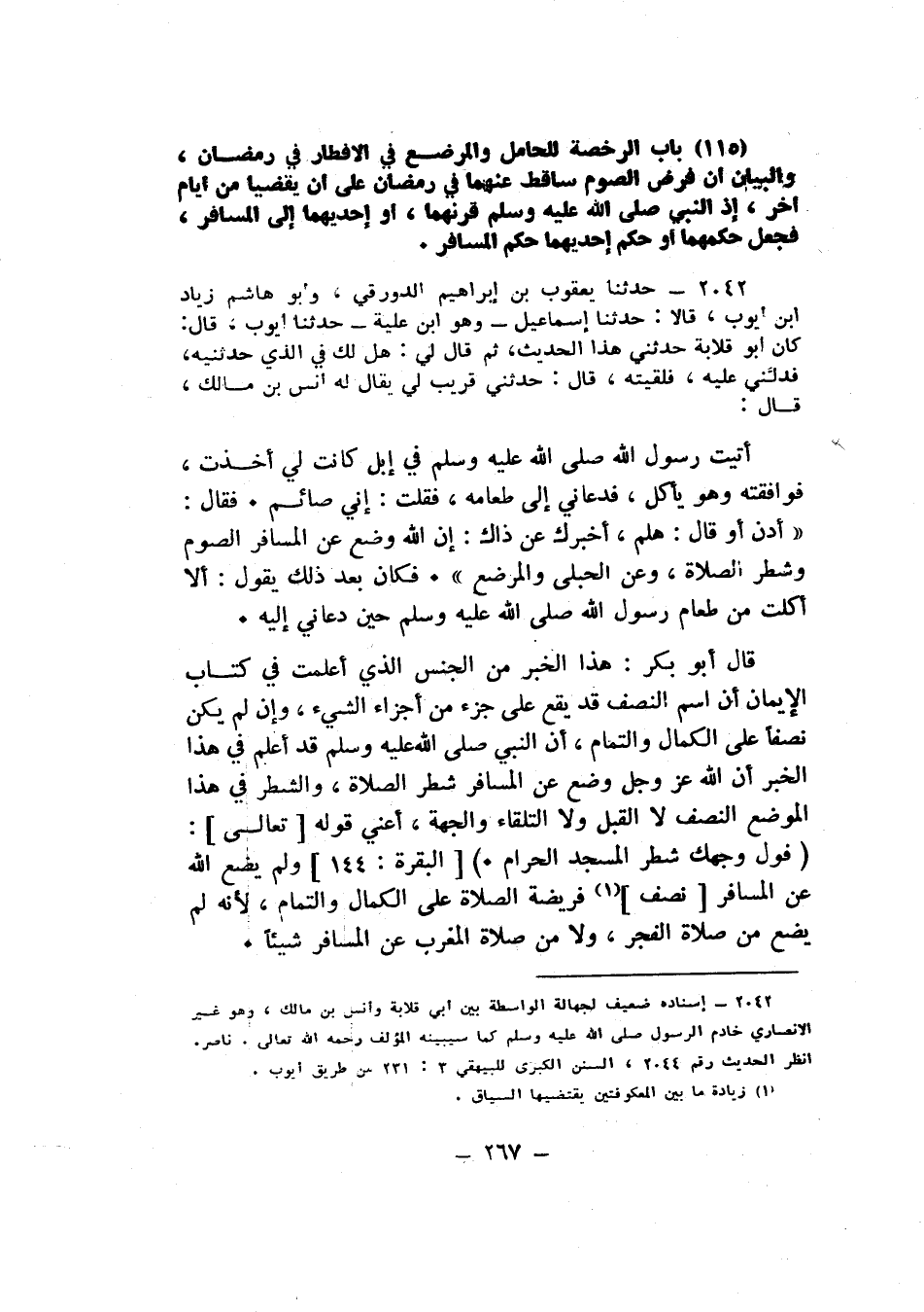 2042 - حَدَّثَنَا يَعْقُوبُ بْنُ إِبْرَاهِيمَ الدَّوْرَقِيُّ، وَأَبُو هَاشِمٍ زِيَادُ بْنُ أَيُّوبَ قَالَا: حَدَّثَنَا إِسْمَاعِيلُ وَهُوَ ابْنُ عُلَيَّةَ , حَدَّثَنَا أَيُّوبُ قَالَ: كَانَ أَبُو قِلَابَةَ حَدَّثَنِي هَذَا الْحَدِيثَ، ثُمَّ قَالَ لِي: هَلْ لَكَ فِي الَّذِي حَدَّثَنِيهِ؟ فَدَلَّنِي عَلَيْهِ , فَلَقِيتُهُ، قَالَ: حَدَّثَنِي قَرِيبٌ لِي يُقَالُ لَهُ أَنَسُ بْنُ مَالِكٍ قَالَ: أَتَيْتُ رَسُولَ اللَّهِ صَلَّى اللهُ عَلَيْهِ وَسَلَّمَ فِي إِبِلٍ كَانَتْ لِي أُخِذَتْ , فَوَافَقْتُهُ وَهُوَ يَأْكُلُ , فَدَعَانِي إِلَى طَعَامِهِ , فَقُلْتُ: إِنِّي صَائِمٌ , فَقَالَ: «ادْنُ» , أَوْ قَالَ: «هَلُمَّ أُخْبِرْكَ عَنْ ذَاكِ , إِنَّ اللَّهَ §وَضَعَ عَنِ الْمُسَافِرِ الصَّوْمَ وَشَطْرَ الصَّلَاةِ , وَعَنِ الْحُبْلَى وَالْمُرْضِعِ» , فَكَانَ بَعْدَ ذَلِكَ يَقُولُ: أَلَا أَكَلْتُ مِنْ طَعَامِ رَسُولِ اللَّهِ صَلَّى اللهُ عَلَيْهِ وَسَلَّمَ حِينَ دَعَانِي إِلَيْهِ قَالَ أَبُو بَكْرٍ: " هَذَا الْخَبَرُ مِنَ الْجِنْسِ الَّذِي أَعْلَمْتُ فِي كِتَابِ الْإِيمَانِ أَنَّ اسْمَ النِّصْفِ قَدْ يَقَعُ عَلَى جُزْءٍ مِنْ أَجْزَاءِ الشَّيْءِ وَإِنْ لَمْ يَكُنْ نِصْفًا عَلَى الْكَمَالِ وَالتَّمَامِ , أَنَّ النَّبِيَّ صَلَّى اللهُ عَلَيْهِ وَسَلَّمَ قَدْ أَعْلَمَ فِي هَذَا الْخَبَرِ أَنَّ اللَّهَ عَزَّ وَجَلَّ وَضَعَ عَنِ الْمُسَافِرِ شَطْرَ الصَّلَاةِ , وَالشَّطْرُ فِي هَذَا الْمَوْضِعِ النِّصْفُ، لَا الْقِبَلُ , وَلَا التِّلْقَاءُ وَالْجِهَةُ , أَعْنِي قَوْلَهُ تَعَالَى: {فَوَلِّ وَجْهَكَ شَطْرَ الْمَسْجِدِ الْحَرَامِ} [البقرة: 144] وَلَمْ يَضَعِ اللَّهُ عَنِ الْمُسَافِرِ نِصْفَ فَرِيضَةِ الصَّلَاةِ عَلَى الْكَمَالِ وَالتَّمَامِ؛ لِأَنَّهُ لَمْ يَضَعْ مِنْ صَلَاةِ الْفَجْرِ وَلَا مِنْ صَلَاةِ الْمَغْرِبِ عَنِ الْمُسَافِرِ شَيْئًا "K2042 - قال الألباني: إسناده ضعيف لجهالة الواسطة بين أبي قلابة وأنس بن مالك وهو غير الأنصاري خادم رسول الله صلى الله عليه وسلم كما سيبينه المؤلف