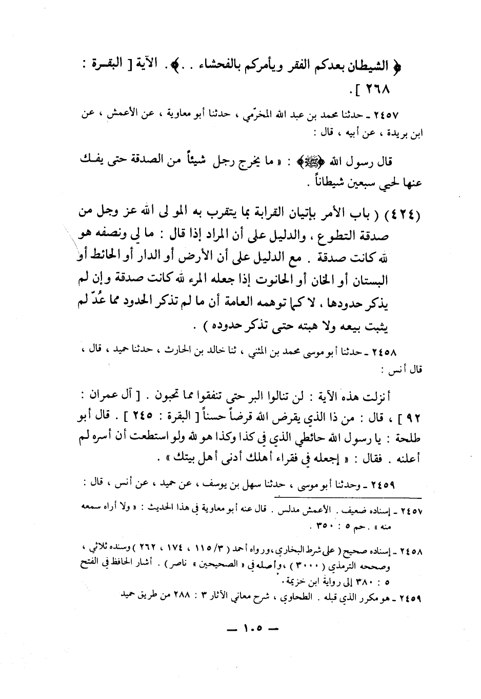 2457 - حَدَّثَنَا مُحَمَّدُ بْنُ عَبْدِ اللَّهِ الْمُخَرِّمِيُّ، حَدَّثَنَا أَبُو مُعَاوِيَةَ، عَنِ الْأَعْمَشِ، عَنِ ابْنِ بُرَيْدَةَ، عَنْ أَبِيهِ قَالَ: قَالَ رَسُولُ اللَّهِ صَلَّى اللهُ عَلَيْهِ وَسَلَّمَ: «§مَا يُخْرِجُ رَجُلٌ شَيْئًا مِنَ الصَّدَقَةِ حَتَّى يَفُكَّ عَنْهَا لَحْيَيْ سَبْعِينَ شَيْطَانًا» K2457 - قال الأعظمي: إسناده ضعيف الأعمش مدلس قال عنه أبو معاوية في هذا الحديث: ما أراه سمعه منه. أحمد 5 / 350
