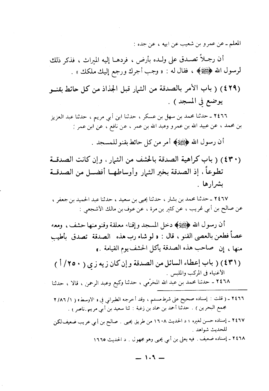 2467 - حَدَّثَنَا مُحَمَّدُ بْنُ بَشَّارٍ، حَدَّثَنَا يَحْيَى بْنُ سَعِيدٍ، حَدَّثَنَا عَبْدُ الْحَمِيدِ بْنُ جَعْفَرٍ، عَنْ صَالِحِ بْنِ أَبِي عَرِيبٍ، عَنْ كَثِيرِ بْنِ مُرَّةَ، عَنْ عَوْفِ بْنِ مَالِكٍ الْأَشْجَعِيِّ، أَنَّ رَسُولَ اللَّهِ صَلَّى اللهُ عَلَيْهِ وَسَلَّمَ دَخَلَ الْمَسْجِدَ، وَإِقْنَاءٌ مُعَلَّقَةٌ، وَقِنْوٌ مِنْهَا حَشَفٌ، وَمَعَهُ عَصًا فَطَعَنَ بِالْعَصَى الْقِنْوَ قَالَ: «§لَوْ شَاءَ رَبُّ هَذِهِ الصَّدَقَةِ تَصَدَّقَ بِأَطْيَبَ مِنْهَا، إِنَّ صَاحِبَ هَذِهِ الصَّدَقَةِ يَأْكُلُ الْحَشَفَ يَوْمَ الْقِيَامَةِ» K2467 - قال الأعظمي: إسناده حسن لغيره صالح بن أبي عريب ضعيف لكن للحديث شواهد