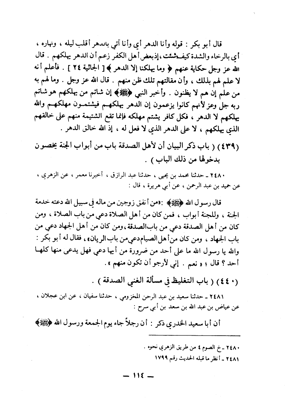 2480 - حَدَّثَنَا مُحَمَّدُ بْنُ يَحْيَى، حَدَّثَنَا عَبْدُ الرَّزَّاقِ، أَخْبَرَنَا مَعْمَرٌ، عَنِ الزُّهْرِيِّ، عَنْ حُمَيْدِ بْنِ عَبْدِ الرَّحْمَنِ، عَنْ أَبِي هُرَيْرَةَ قَالَ: قَالَ رَسُولُ اللَّهِ صَلَّى اللهُ عَلَيْهِ وَسَلَّمَ: «§مَنْ أَنْفَقَ زَوْجَيْنِ مِنْ مَالِهِ فِي سَبِيلِ اللَّهِ دَعَتْهُ خَدَمَةُ الْجَنَّةِ، وَلِلْجَنَّةِ أَبْوَابٌ فَمَنْ كَانَ مِنْ أَهْلِ الصَّلَاةِ دُعِيَ مِنْ بَابِ الصَّلَاةِ، وَمَنْ كَانَ مِنْ أَهْلِ الصَّدَقَةِ دُعِيَ مِنْ بَابِ الصَّدَقَةِ، وَمَنْ كَانَ مِنْ أَهْلِ الْجِهَادِ دُعِيَ مِنْ بَابِ الْجِهَادِ، وَمَنْ كَانَ مِنْ أَهْلِ الصِّيَامِ دُعِيَ مِنْ بَابِ الرَّيَّانِ» ، فَقَالَ لَهُ أَبُو بَكْرٍ: وَاللَّهِ يَا رَسُولَ اللَّهِ مَا عَلَى أَحَدٍ مِنْ ضَرُورَةٍ مِنْ أَيِّهَا دُعِيَ، فَهَلْ يُدْعَى مِنْهَا كُلِّهَا أَحَدٌ؟ قَالَ: «نَعَمْ إِنِّي لَأَرْجُو أَنْ تَكُونَ مِنْهُمْ»