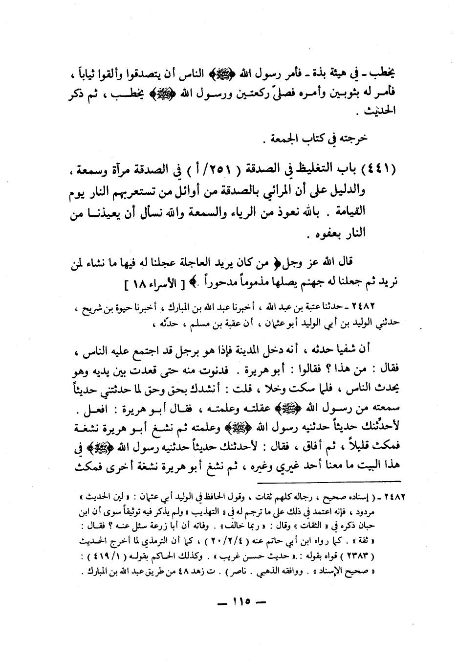 2482 - حَدَّثَنَا عُتْبَةُ بْنُ عَبْدِ اللَّهِ، أَخْبَرَنَا عَبْدُ اللَّهِ بْنُ الْمُبَارَكِ، أَخْبَرَنَا حَيْوَةُ بْنُ شُرَيْحٍ، حَدَّثَنِي الْوَلِيدُ بْنُ أَبِي الْوَلِيدِ أَبُو عُثْمَانَ، أَنَّ عُقْبَةَ بْنَ مُسْلِمٍ، حَدَّثَهُ أَنَّ شُفَيًّا، حَدَّثَهُ: أَنَّهُ دَخَلَ الْمَدِينَةَ، فَإِذَا هُوَ بِرَجُلٍ قَدِ اجْتَمَعَ عَلَيْهِ النَّاسُ، فَقَالَ: مَنْ هَذَا؟ فَقَالُوا: أَبُو هُرَيْرَةَ، فَدَنَوْتُ مِنْهُ حَتَّى قَعَدْتُ بَيْنَ يَدَيْهِ، وَهُوَ يُحَدِّثُ النَّاسَ، فَلَمَّا سَكَتَ وَخَلَا، قُلْتُ: أَنْشُدُكَ بِحَقٍّ وَحَقٍّ لَمَّا حَدَّثْتَنِي حَدِيثًا سَمِعْتَهُ مِنْ رَسُولِ اللَّهِ صَلَّى اللهُ عَلَيْهِ وَسَلَّمَ عَقَلْتَهُ وَعَلِمْتَهُ، فَقَالَ أَبُو هُرَيْرَةَ: أَفْعَلُ، لَأُحَدِّثَنَّكَ حَدِيثًا حَدَّثَنِيهِ رَسُولُ اللَّهِ صَلَّى اللهُ عَلَيْهِ وَسَلَّمَ وَعَلِمْتُهُ، ثُمَّ نَشَغَ أَبُو هُرَيْرَةَ نَشْغَةً، فَمَكَثَ قَلِيلًا، ثُمَّ أَفَاقَ، فَقَالَ: لَأُحَدِّثَنَّكَ حَدِيثًا حَدَّثَنِيهِ رَسُولُ اللَّهِ صَلَّى اللهُ عَلَيْهِ وَسَلَّمَ فِي هَذَا الْبَيْتِ مَا مَعَنَا أَحَدٌ غَيْرِي وَغَيْرُهُ، ثُمَّ نَشَغَ أَبُو هُرَيْرَةَ نَشْغَةً أُخْرَى، فَمَكَثَ -[116]- بِذَلِكَ، ثُمَّ أَفَاقَ وَمَسَحَ وَجْهَهُ قَالَ: أَفْعَلُ لَأُحَدِّثَنَّكَ بِحَدِيثٍ حَدَّثَنِيهِ رَسُولُ اللَّهِ صَلَّى اللهُ عَلَيْهِ وَسَلَّمَ، وَأَنَا وَهُوَ فِي هَذَا الْبَيْتِ مَا مَعَنَا أَحَدٌ غَيْرِي وَغَيْرُهُ، ثُمَّ نَشَغَ أَبُو هُرَيْرَةَ نَشْغَةً شَدِيدَةً، ثُمَّ مَالَ خَارًّا عَلَى وَجْهِهِ أَسْنَدْتُهُ طَوِيلًا، ثُمَّ أَفَاقَ، فَقَالَ: حَدَّثَنِي رَسُولُ اللَّهِ صَلَّى اللهُ عَلَيْهِ وَسَلَّمَ: " إِنَّ §اللَّهَ تَبَارَكَ وَتَعَالَى إِذَا كَانَ يَوْمُ الْقِيَامَةِ نَزَلَ إِلَى الْعِبَادِ لِيَقْضِيَ بَيْنَهُمْ، وَكُلُّ أُمَّةٍ جَاثِيَةٌ، فَأَوَّلُ مَنْ يَدْعُو بِهِ رَجُلٌ جَمَعَ الْقُرْآنَ، وَرَجُلٌ يُقْتَلُ فِي سَبِيلِ اللَّهِ، وَرَجُلٌ كَثِيرُ الْمَالِ، فَيَقُولُ لِلْقَارِئِ: أَلَمْ أُعَلِّمْكَ مَا أَنْزَلْتُ عَلَى رَسُولِي؟ قَالَ: بَلَى يَا رَبِّ قَالَ: فَمَاذَا عَمِلْتَ فِيمَا عُلِّمْتَ؟ قَالَ: كُنْتُ أَقُومُ بِهِ أَثْنَاءَ اللَّيْلِ وَآنَاءَ النَّهَارِ، فَيَقُولُ اللَّهُ لَهُ: كَذَبْتَ، وَتَقُولُ الْمَلَائِكَةُ: كَذَبْتَ، وَيَقُولُ اللَّهُ: بَلْ أَرَدْتَ أَنْ يُقَالَ: فُلَانٌ قَارِئٌ، فَقَدْ قِيلَ، وَيُؤْتَى بِصَاحِبِ الْمَالِ فَيَقُولُ اللَّهُ: أَلَمْ أُوَسِّعْ عَلَيْكَ حَتَّى لَمْ أَدَعْكَ تَحْتَاجُ إِلَى أَحَدٍ؟ قَالَ: بَلَى قَالَ: فَمَاذَا عَمِلْتَ فِيمَا آتَيْتُكَ؟ قَالَ: كُنْتُ أَصِلُ الرَّحِمَ، وَأَتَصَدَّقُ؟ فَيَقُولُ اللَّهُ: كَذَبْتَ، وَتَقُولُ الْمَلَائِكَةُ: كَذَبْتَ، فَيَقُولُ اللَّهُ: بَلْ أَرَدْتَ أَنْ يُقَالَ: فُلَانٌ جَوَّادٌ، فَقَدْ قِيلَ ذَاكَ، وَيُؤْتِي بِالَّذِي قُتِلَ فِي سَبِيلِ اللَّهِ، فَيُقَالُ لَهُ: فِيمَ قُتِلْتَ؟ فَيَقُولُ: أُمِرْتُ بِالْجِهَادِ فِي سَبِيلِكَ، فَقَاتَلْتُ حَتَّى قُتِلْتُ، فَيَقُولُ اللَّهُ: كَذَبْتَ، وَتَقُولُ الْمَلَائِكَةُ: كَذَبْتَ، وَيَقُولُ اللَّهُ عَزَّ وَجَلَّ لَهُ: بَلْ أَرَدْتَ أَنْ يُقَالَ: فُلَانٌ جَرِيءٌ: فَقَدْ قِيلَ ذَلِكَ "، ثُمَّ ضَرَبَ رَسُولُ اللَّهِ صَلَّى اللهُ عَلَيْهِ وَسَلَّمَ عَلَى رُكْبَتَيَّ، فَقَالَ: «يَا أَبَا هُرَيْرَةَ، أُولَئِكَ الثَّلَاثَةُ أَوَّلُ خَلْقِ اللَّهِ تُسَعَّرُ بِهِمُ النَّارُ يَوْمَ الْقِيَامَةِ» . قَالَ الْوَلِيدُ: فَأَخْبَرَنِي عُقْبَةُ أَنَّ شُفَيًّا هُوَ الَّذِي دَخَلَ عَلَى مُعَاوِيَةَ فَأَخْبَرَهُ بِهَذَا قَالَ أَبُو عُثْمَانَ: وَحَدَّثَنِي الْعَلَاءُ بْنُ أَبِي حَكِيمٍ أَنَّهُ كَانَ 
