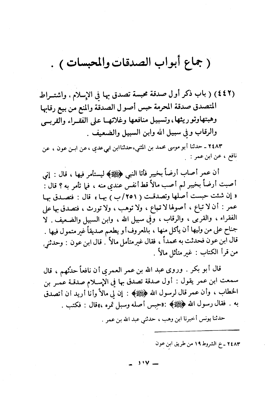 2483 - حَدَّثَنَا أَبُو مُوسَى مُحَمَّدُ بْنُ الْمُثَنَّى، حَدَّثَنَا ابْنُ أَبِي عَدِيٍّ، عَنِ ابْنِ عَوْنٍ، عَنْ نَافِعٍ، عَنِ ابْنِ عُمَرَ: أَنَّ عُمَرَ أَصَابَ أَرْضًا بِخَيْبَرٍ، فَأَتَى النَّبِيَّ صَلَّى اللهُ عَلَيْهِ وَسَلَّمَ لِيَسْتَأْمِرَ فِيهَا قَالَ: إِنِّي أَصَبْتُ أَرْضًا بِخَيْبَرٍ لَمْ أُصِبْ مَالًا قَطُّ أَنْفَسَ عِنْدِي مِنْهُ، فَمَا تَأْمُرُ بِهِ قَالَ: «§إِنْ شِئْتَ حَبَسْتَ أَصْلَهَا، وَتَصَدَّقْتَ بِهَا» قَالَ: فَتَصَدَّقَ بِهَا عُمَرُ أَنْ لَا تُبَاعَ أُصُولُهَا، لَا تُبَاعُ وَلَا تُوهَبُ، وَلَا تُوَرَّثُ، فَتَصَدَّقَ بِهَا عَلَى الْفُقَرَاءِ وَالْقُرْبَى وَالرِّقَابِ وَفِي سَبِيلِ اللَّهِ وَابْنِ السَّبِيلِ وَالضَّعِيفِ لَا جُنَاحَ عَلَى مَنْ وَلِيَهَا أَنْ يَأْكُلَ مِنْهَا بِالْمَعْرُوفِ أَوْ يُطْعِمُ صَدِيقًا غَيْرَ مُتَمَوِّلٍ فِيهَا قَالَ ابْنُ عَوْنٍ: فَحَدَّثْتُ بِهِ مُحَمَّدًا، فَقَالَ: «غَيْرُ مُتَأَمِّلٍ مَالًا» قَالَ ابْنُ عَوْنٍ: وَحَدَّثَنِي مَنْ قَرَأَ الْكِتَابَ: «غَيْرُ مُتَأَثِّلٍ مَالًا»