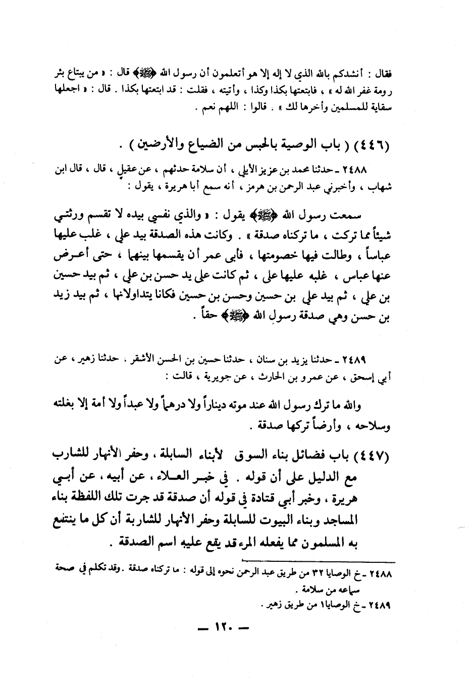 2489 - حَدَّثَنَا يَزِيدُ بْنُ سِنَانٍ، حَدَّثَنَا حُسَيْنُ بْنُ الْحَسَنِ الْأَشْقَرُ، حَدَّثَنَا زُهَيْرٌ، عَنْ أَبِي إِسْحَاقَ، عَنْ عَمْرِو بْنِ الْحَارِثِ، عَنْ جُوَيْرِيَةَ قَالَتْ: «وَاللَّهِ §مَا تَرَكَ رَسُولُ اللَّهِ عِنْدَ مَوْتِهِ دِينَارًا، وَلَا دِرْهَمًا، وَلَا عَبْدًا وَلَا أَمَةً إِلَّا بَغْلَتَهُ وَسِلَاحَهُ وَأَرْضًا تَرَكَهَا صَدَقَةً»