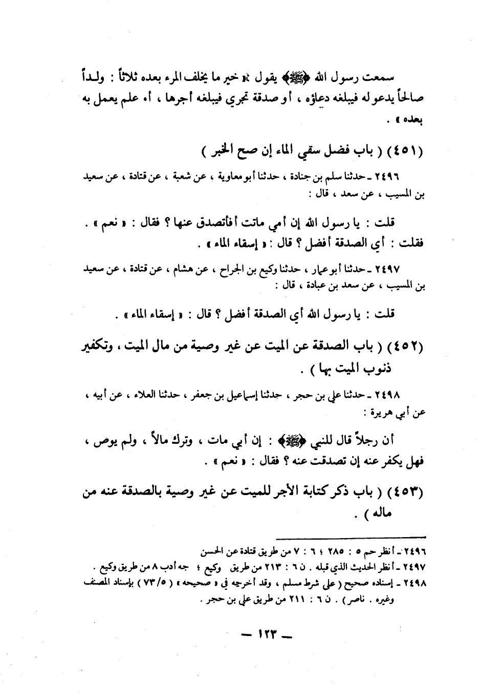 2496 - حَدَّثَنَا سَلْمُ بْنُ جُنَادَةَ، حَدَّثَنَا أَبُو مُعَاوِيَةَ، عَنْ شُعْبَةَ، عَنْ قَتَادَةَ، عَنْ سَعِيدِ بْنِ الْمُسَيِّبِ، عَنْ سَعْدٍ قَالَ: قُلْتُ: يَا رَسُولَ اللَّهِ إِنَّ §أُمِّي مَاتَتْ أَفَأَتَصَدَّقُ عَنْهَا؟ فَقَالَ: «نَعَمْ» ، فَقُلْتُ: أَيُّ صَدَقَةٍ أَفْضَلُ؟ قَالَ: «إِسْقَاءُ الْمَاءِ»