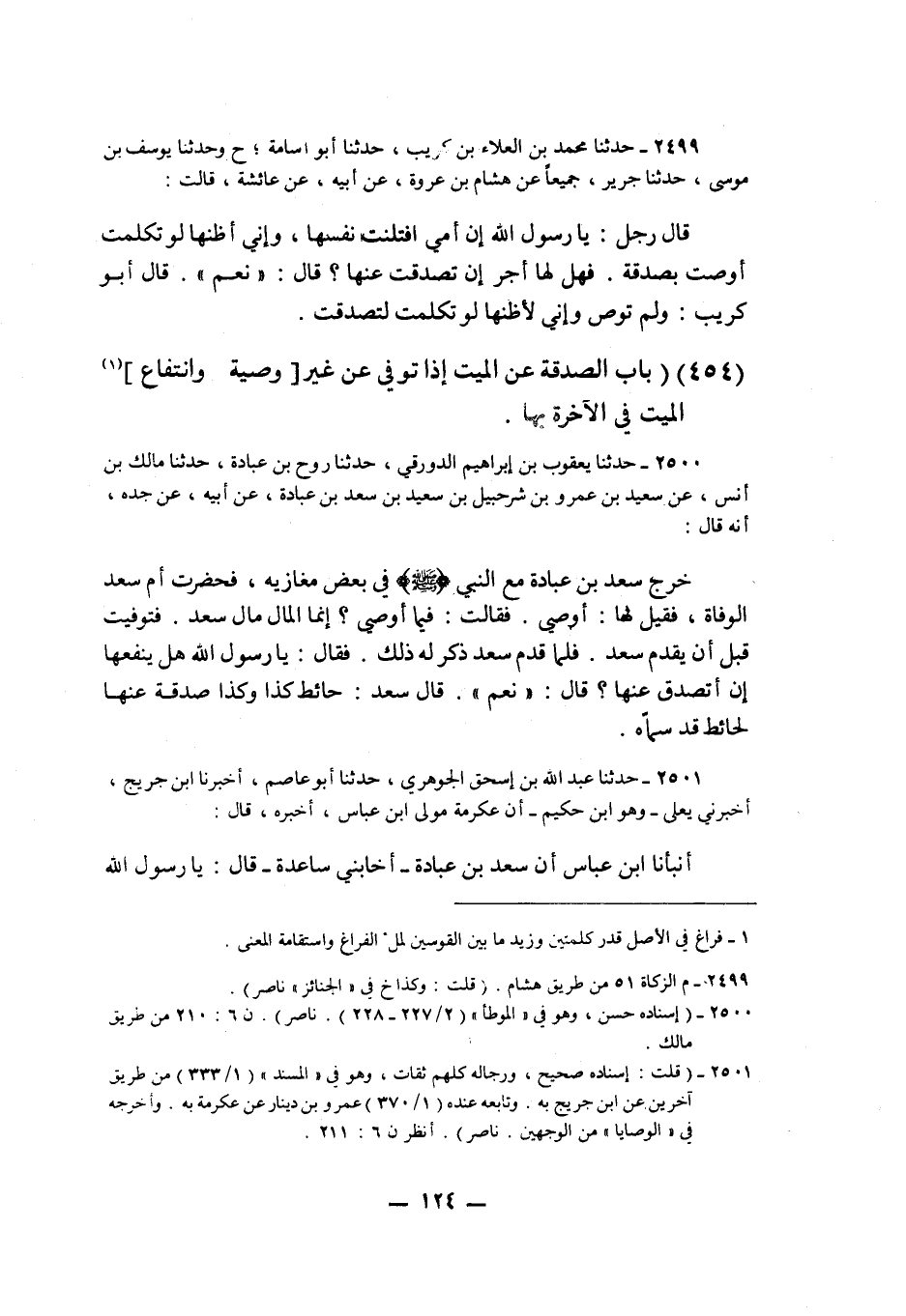2500 - حَدَّثَنَا يَعْقُوبُ بْنُ إِبْرَاهِيمَ الدَّوْرَقِيُّ، حَدَّثَنَا رَوْحُ بْنُ عُبَادَةَ، حَدَّثَنَا مَالِكُ بْنُ أَنَسٍ، عَنْ سَعِيدِ بْنِ عَمْرِو بْنِ شُرَحْبِيلَ بْنِ سَعِيدِ بْنِ سَعْدِ بْنِ عُبَادَةَ، عَنْ أَبِيهِ، عَنْ جَدِّهِ، أَنَّهُ قَالَ: خَرَجَ سَعْدُ بْنُ عُبَادَةَ مَعَ النَّبِيِّ صَلَّى اللهُ عَلَيْهِ وَسَلَّمَ فِي بَعْضِ مَغَازِيهِ فَحَضَرَتْ أُمَّ سَعْدٍ الْوَفَاةُ، فَقِيلَ لَهَا: أُوصِي، فَقَالَتْ: فِيمَا أُوصِي؟ إِنَّمَا الْمَالُ مَالُ سَعْدٍ، فَتُوُفِّيَتْ قَبْلَ أَنْ يَقْدُمَ سَعْدٌ، فَلَمَّا قَدِمَ سَعْدٌ ذُكِرَ لَهُ ذَلِكَ، فَقَالَ: يَا رَسُولَ اللَّهِ §هَلْ يَنْفَعُهَا أَنْ أَتَصَدَّقَ عَنْهَا؟ قَالَ: «نَعَمْ» قَالَ سَعْدٌ: حَائِطُ كَذَا وَكَذَا صَدَقَةٌ عَنْهَا، لِحَائِطٍ قَدْ سَمَّاهُK2500 - قال الأعظمي: إسناده حسن