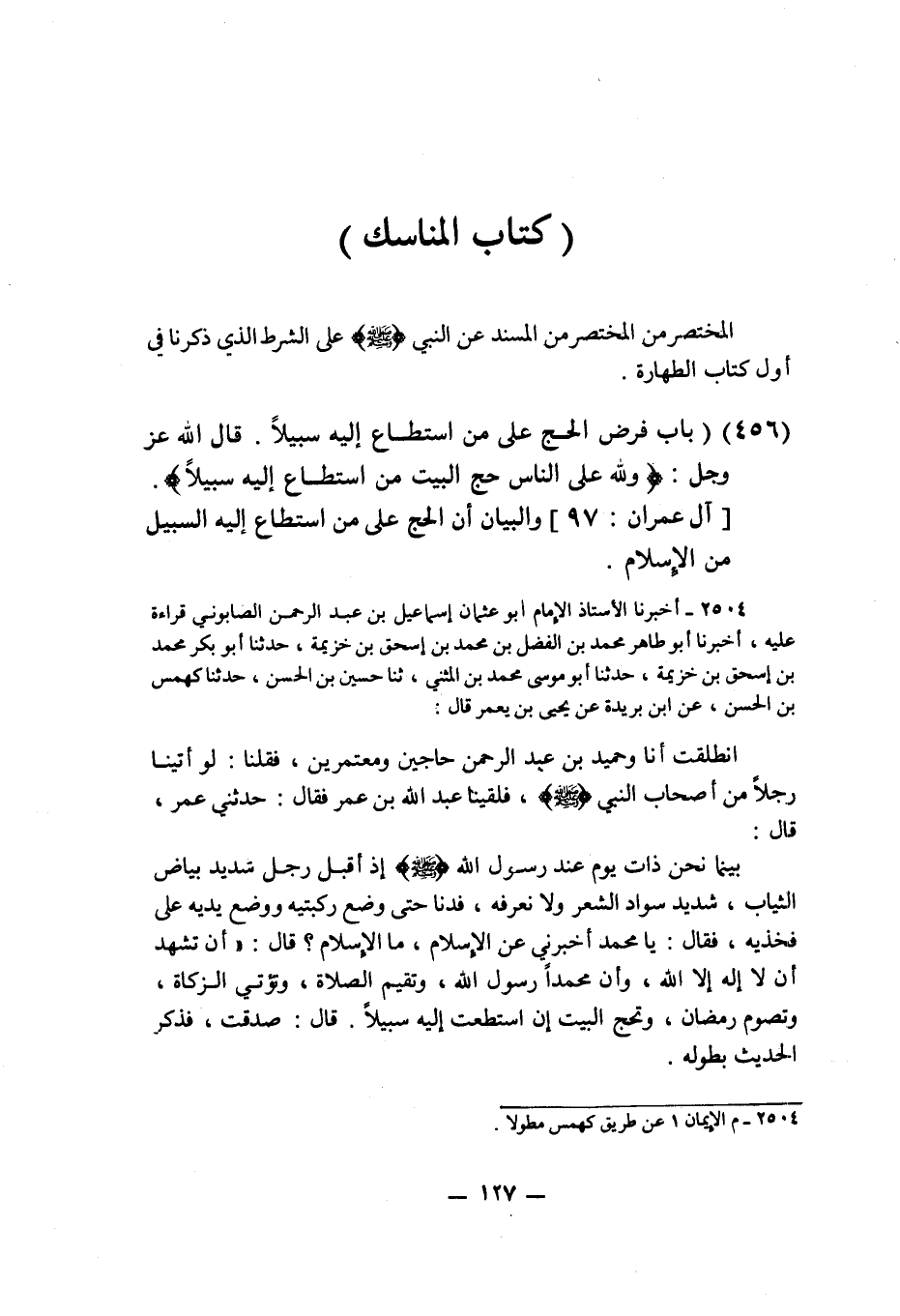 2504 - حَدَّثَنَا أَبُو مُوسَى مُحَمَّدُ بْنُ الْمُثَنَّى، ثنا حُسَيْنُ بْنُ الْحَسَنِ، حَدَّثَنَا كَهْمَسُ بْنُ الْحَسَنِ، عَنِ ابْنِ بُرَيْدَةَ، عَنْ يَحْيَى بْنِ يَعْمَرَ قَالَ: انْطَلَقْتُ أَنَا وَحُمَيْدُ بْنُ عَبْدِ الرَّحْمَنِ حَاجَّيْنِ وَمُعْتَمِرَيْنِ، فَقُلْنَا: لَوْ أَتَيْنَا رَجُلًا مِنْ أَصْحَابِ النَّبِيِّ صَلَّى اللهُ عَلَيْهِ وَسَلَّمَ فَلَقِينَا عَبْدَ اللَّهِ بْنَ عُمَرَ، فَقَالَ: حَدَّثَنِي عُمَرُ قَالَ: بَيْنَمَا نَحْنُ ذَاتُ يَوْمٍ عِنْدَ رَسُولِ اللَّهِ صَلَّى اللهُ عَلَيْهِ وَسَلَّمَ إِذْ أَقْبَلَ رَجُلٌ شَدِيدُ بَيَاضِ الثِّيَابِ، شَدِيدُ سَوَادِ الشَّعَرِ، وَلَا نَعْرِفُهُ فَدَنَا حَتَّى وَضَعَ رُكْبَتَيْهِ وَوضَعَ يَدَيْهِ عَلَى فَخِذَيْهِ، فَقَالَ: يَا مُحَمَّدُ أَخْبِرْنِي عَنِ الْإِسْلَامِ، §مَا الْإِسْلَامُ؟ قَالَ: «أَنْ تَشْهَدَ أَنْ لَا إِلَهَ إِلَّا اللَّهُ، وَأَنَّ مُحَمَّدًا رَسُولُ اللَّهِ، وَتُقِيمَ الصَّلَاةَ، وَتُؤْتِيَ الزَّكَاةَ، وَتَصُومَ رَمَضَانَ، وَتَحُجَّ الْبَيْتِ إِنِ اسْتَطَعْتَ إِلَيْهِ سَبِيلًا» قَالَ: صَدَقْتَ، فَذَكَرَ الْحَدِيثَ بِطُولِهِ، حَدَّثَنَا أَبُو مُوسَى، حَدَّثَنَا مُعَاذُ بْنُ مُعَاذٍ، حَدَّثَنَا كَهْمَسٌ بِهَذَا الْحَدِيثِ نَحْوِهِK2504 - انظر ما سبق